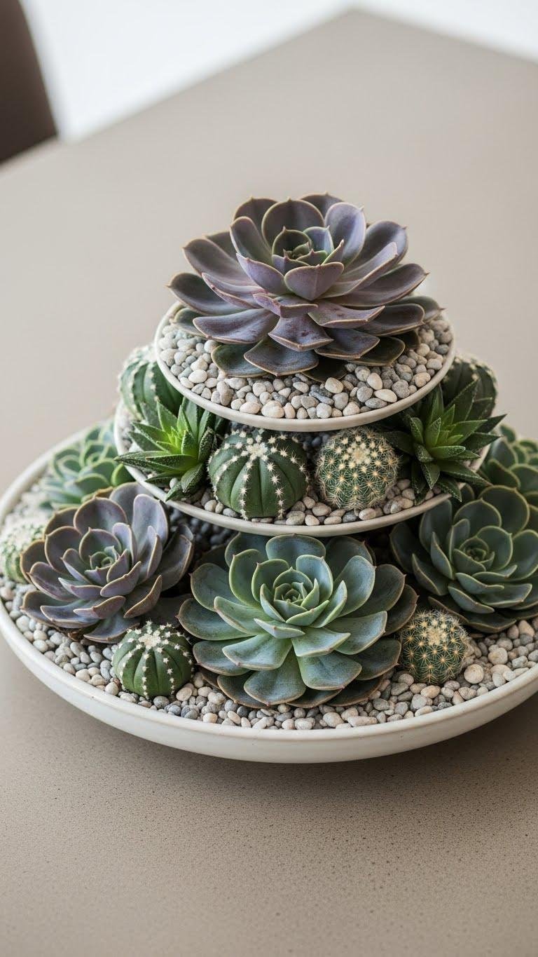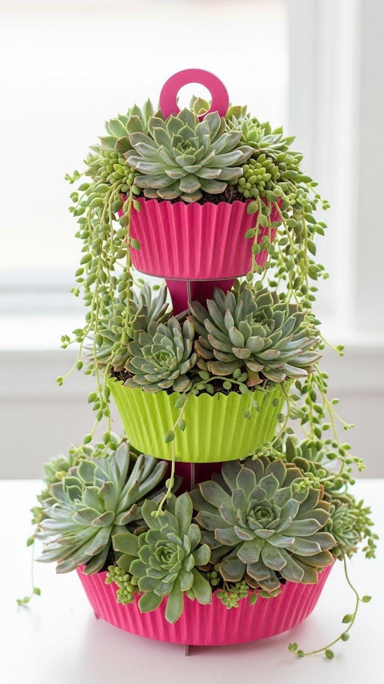 You’ll repurpose a tiered stand into a bold cupcake centerpiece, arranging hardy rosettes and trailing sedums. It celebrates vertical propagation, easy watering, and airflow.