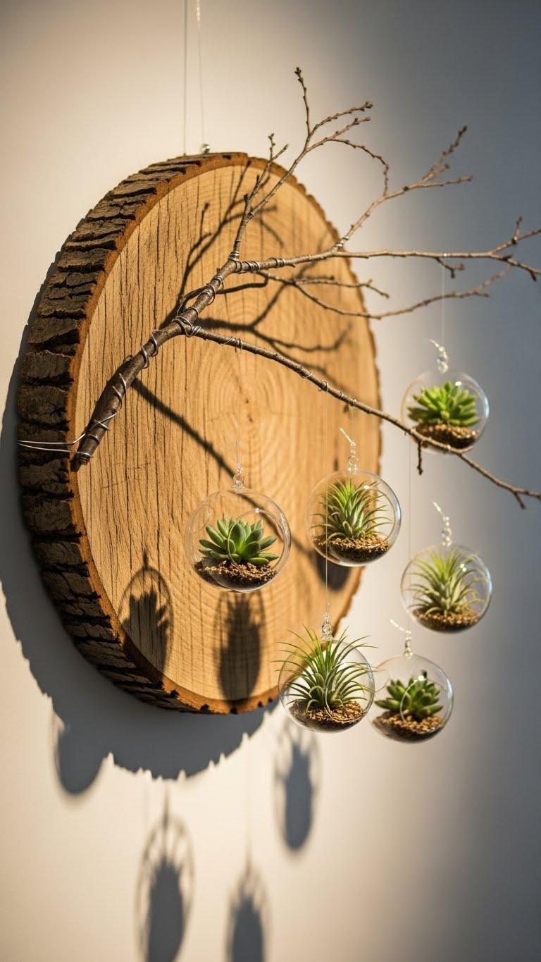 Bring a slice of the forest indoors by mounting a reclaimed wood round and wiring on a few delicate branches, then suspend glass pods to cradle tiny succulents and air plants.