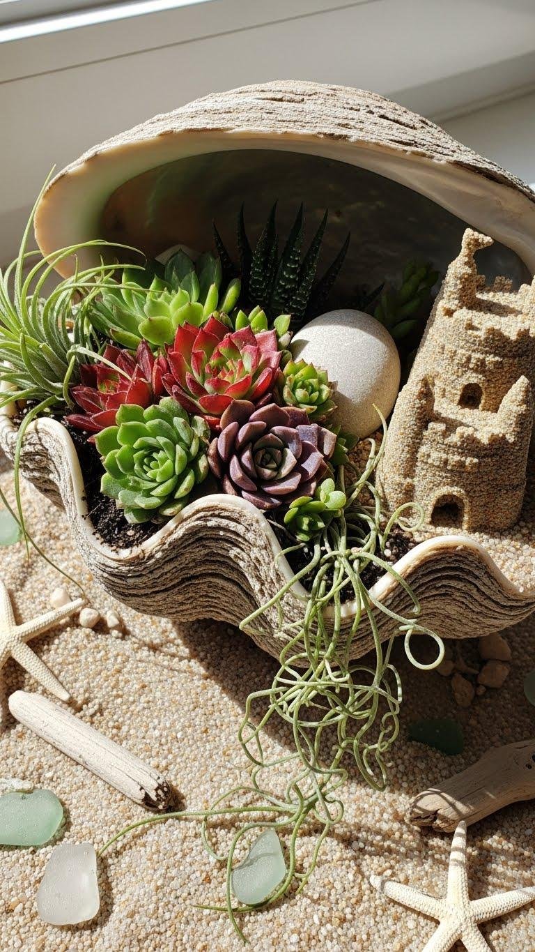 When you nest tiny succulents and air plants inside a large, weathered clamshell, you create a compact coastal vignette that reads both sculptural and seaside-chic.