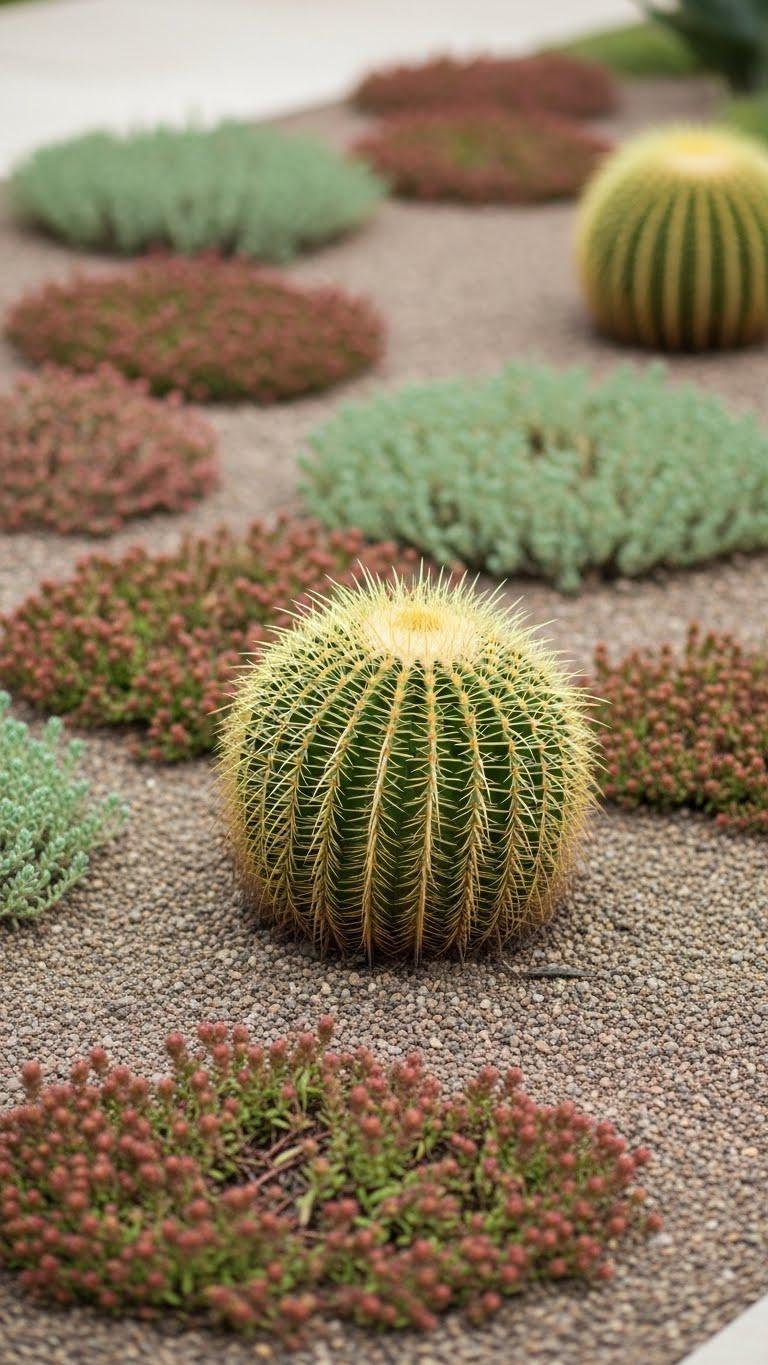 Often you’ll let a single golden barrel cactus anchor the bed, its ribbed globe providing a bold, architectural counterpoint to low, spreading sedums.