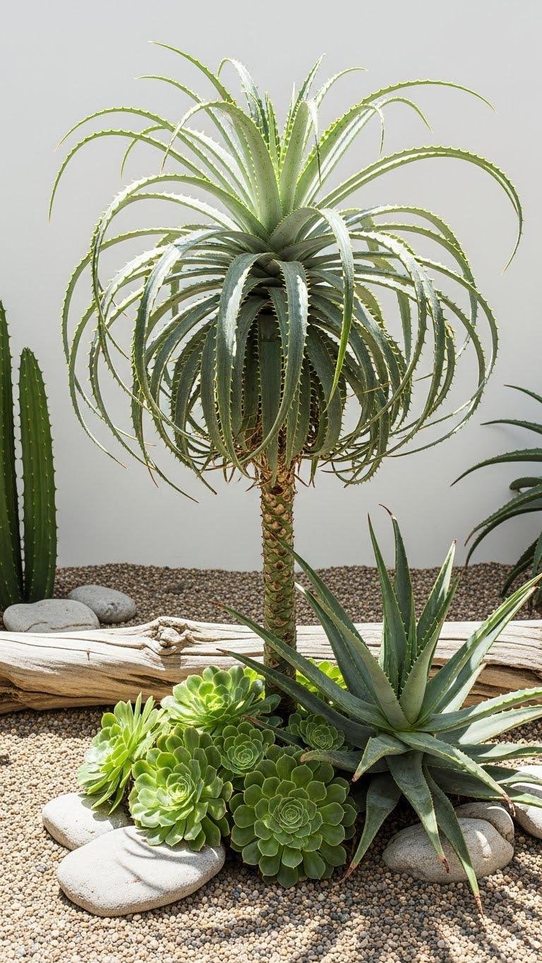 If you let a sculptural Dasylirion anchor the composition, its spiky, fountain-like leaves will set a dramatic silhouette against low rosettes of Aeonium and architectural Aloe.