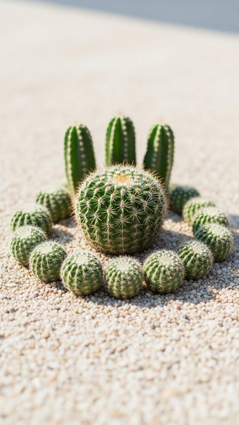 A compact sphere of cactus commands the vignette, its rounded form softened by a halo of smaller Mammillaria and Parodia that trace its silhouette like punctuation. You arrange with restraint, balancing textural contrast between velvet ribs and sharp areoles.