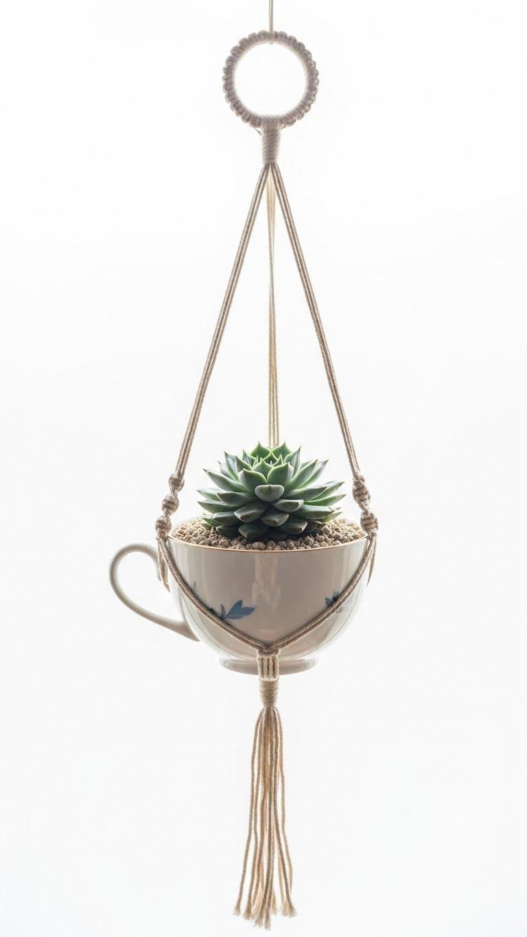 Swing a delicate teacup from a thin macramé loop and you’ve turned a humble vessel into a sculptural micro-garden. You’ll choose a vintage teacup, add gritty soil and a compact succulent, then suspend it with a minimalist macramé hanger near bright, indirect light.