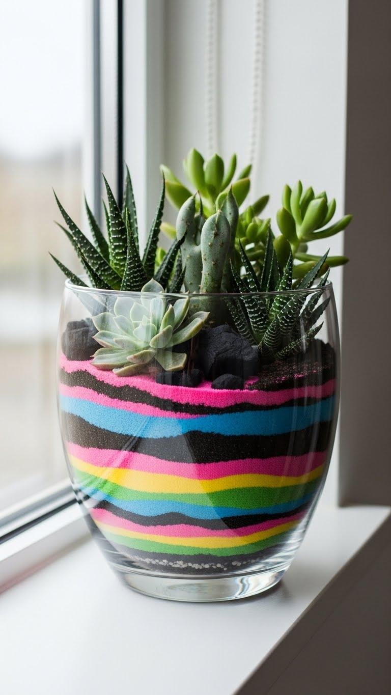 A clear glass vessel turns layered sand and succulents into a living sculpture you can place on a windowsill or coffee table.