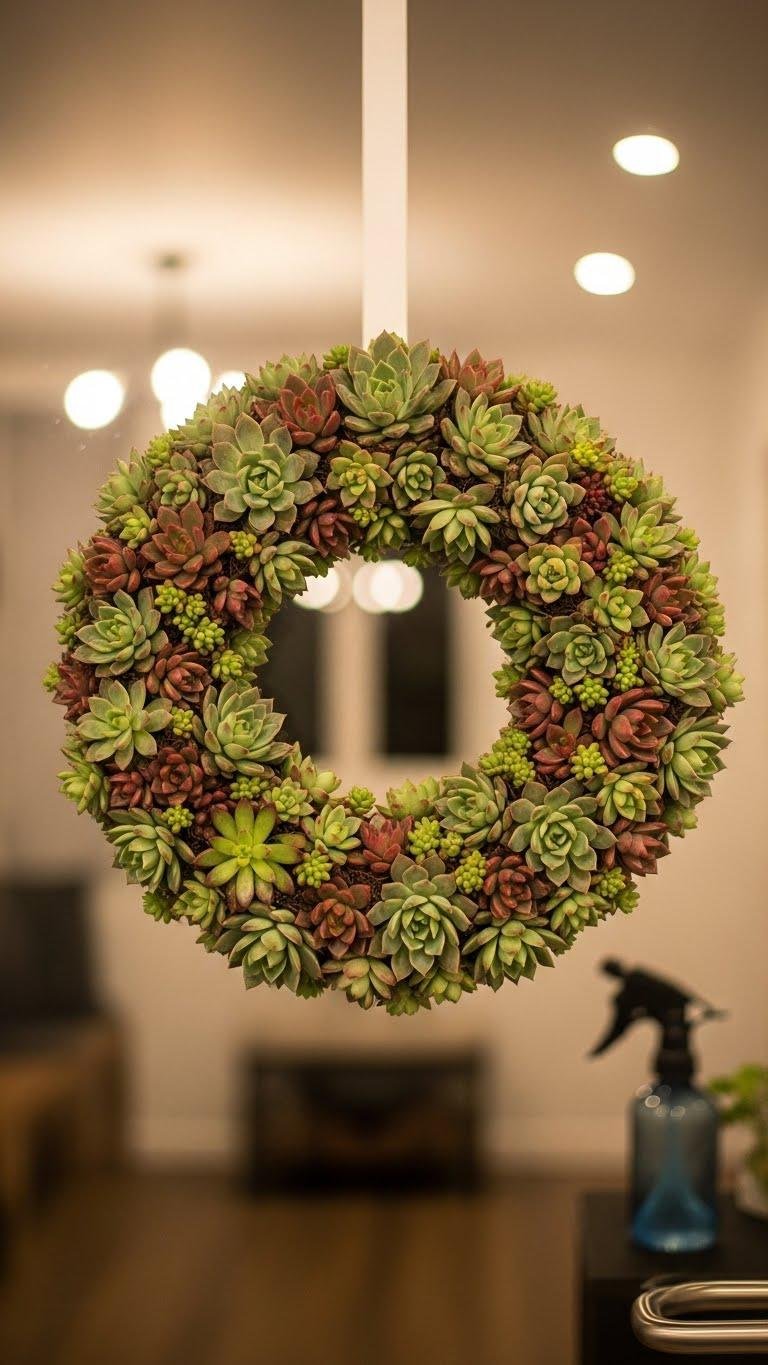 Bringing living texture to your entry, a succulent wreath blends sculptural form with low-maintenance function—perfect for indoor doors where light is limited but style matters.