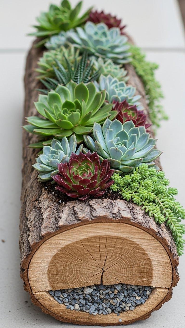 Using a hollow log as your base gives you an instant, organic vessel that’s both rustic and refined; you’ll fill it with low-growing rosettes, trailing sedums, and a few sculptural echeverias to balance form and flow.
