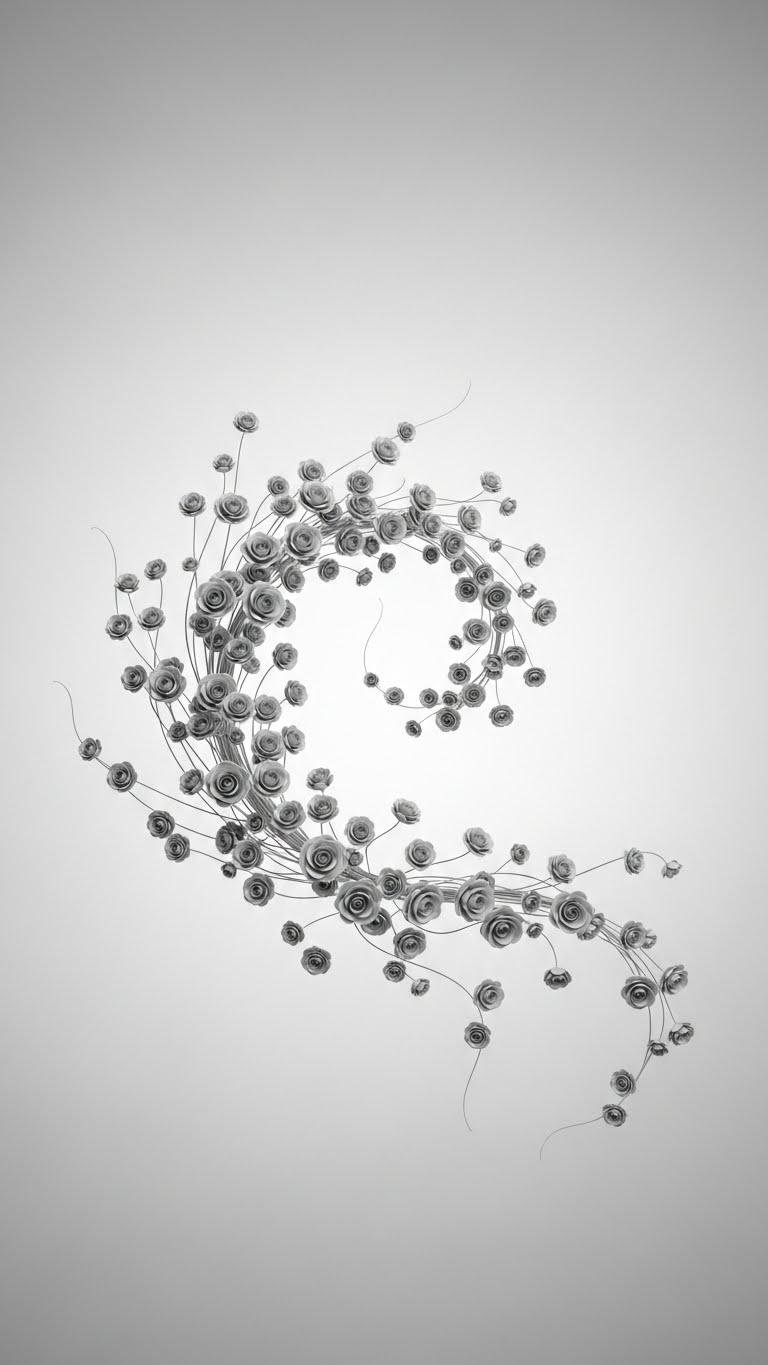 If the grid reads like a living graphic, the swirl plays like motion captured — a spiral of tiny rosettes and trailing stems that channels energy while leaving breathing room. You arrange an abstract swirl with confident spacing, favoring negative space and minimalist contrast.