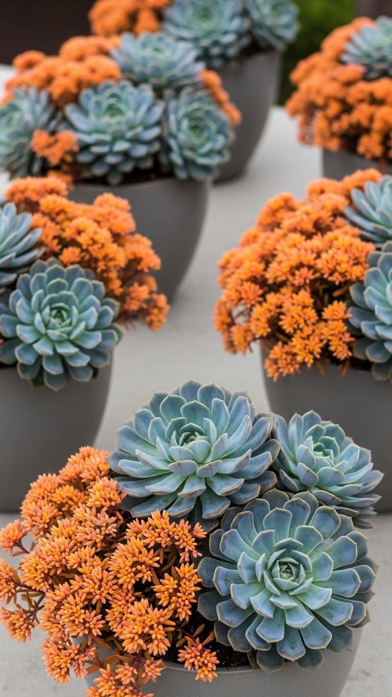 Lean into contrast: pair blue-gray rosettes like pachyverias and echeverias with warm orange sedums and crassulas to create a punchy complementary scheme that still reads refined. You’ll favor clean lines, letting blue contrast anchor the composition while orange accents punctuate rhythm.