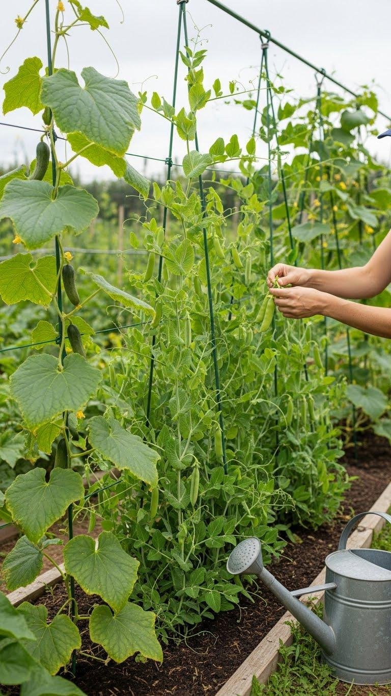 Alongside those climbing cucumbers, snap peas make a perfect companion crop that gives you a daily supply of crisp, sweet pods. Plant seeds along a sturdy vertical trellis, train vines upward, and harvest every morning.