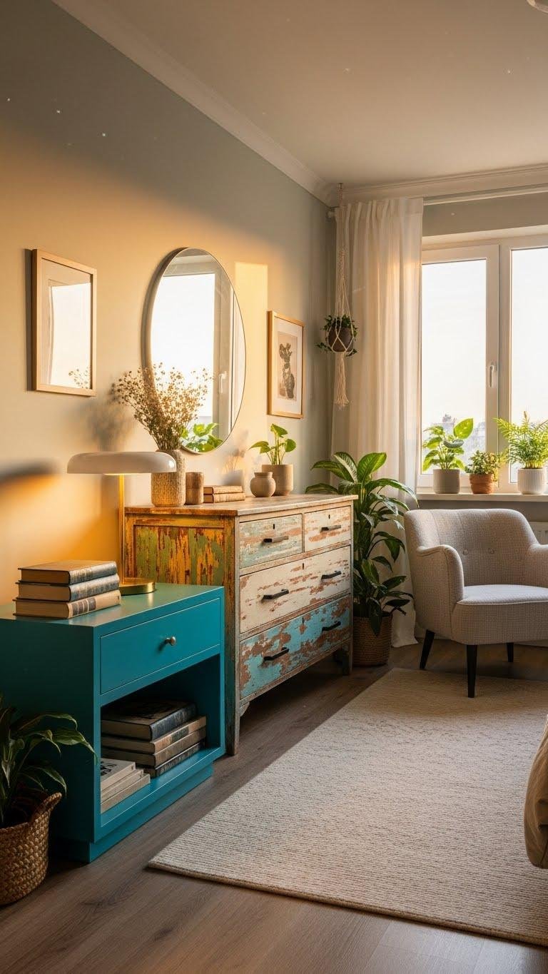 Give old pieces new life with a fresh coat or simple tweaks that make a real visual impact without a big spend. You’ll repaint painted nightstands in bold hues, distress reclaimed dressers for character, add new hardware, and seal for weather. Place pieces as focal anchors, mix textures, and move them freely to shift mood — practical, portable upgrades that feel liberating and luxe.