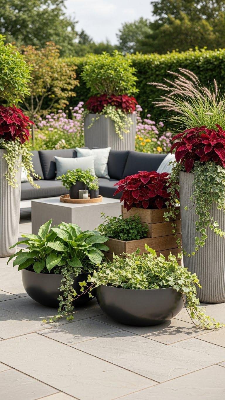Place bold foliage, trailing vines, and sculptural grasses so you can rearrange freely. Group on patios, steps, or corners to frame seating, create privacy, and elevate a simple budget plot.