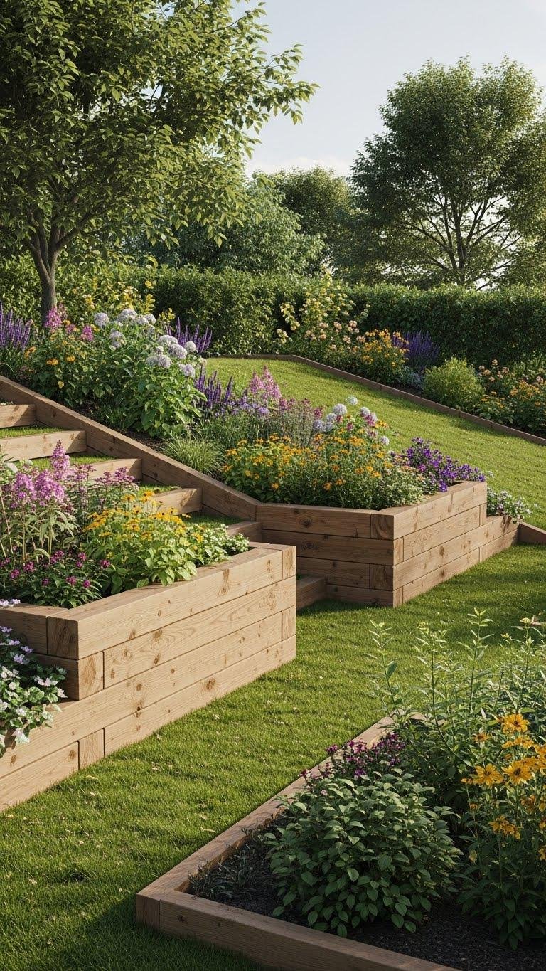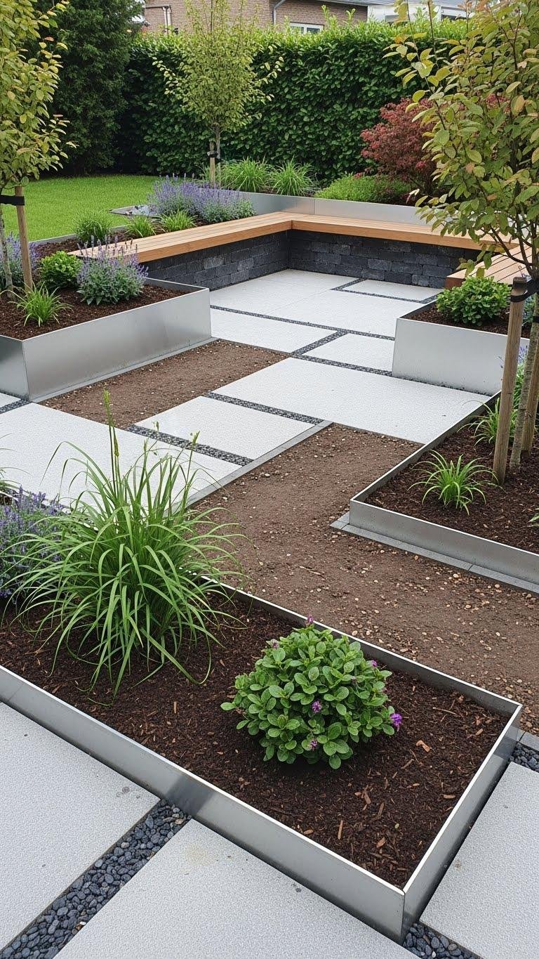 After you’ve used sleepers to carve beds and seating, clean metal or stone edging sharpens those lines and keeps soil and mulch from spilling into paths. You’ll install sleek borderlines that read modern and minimal; stone offers textured coping for tactile contrast.