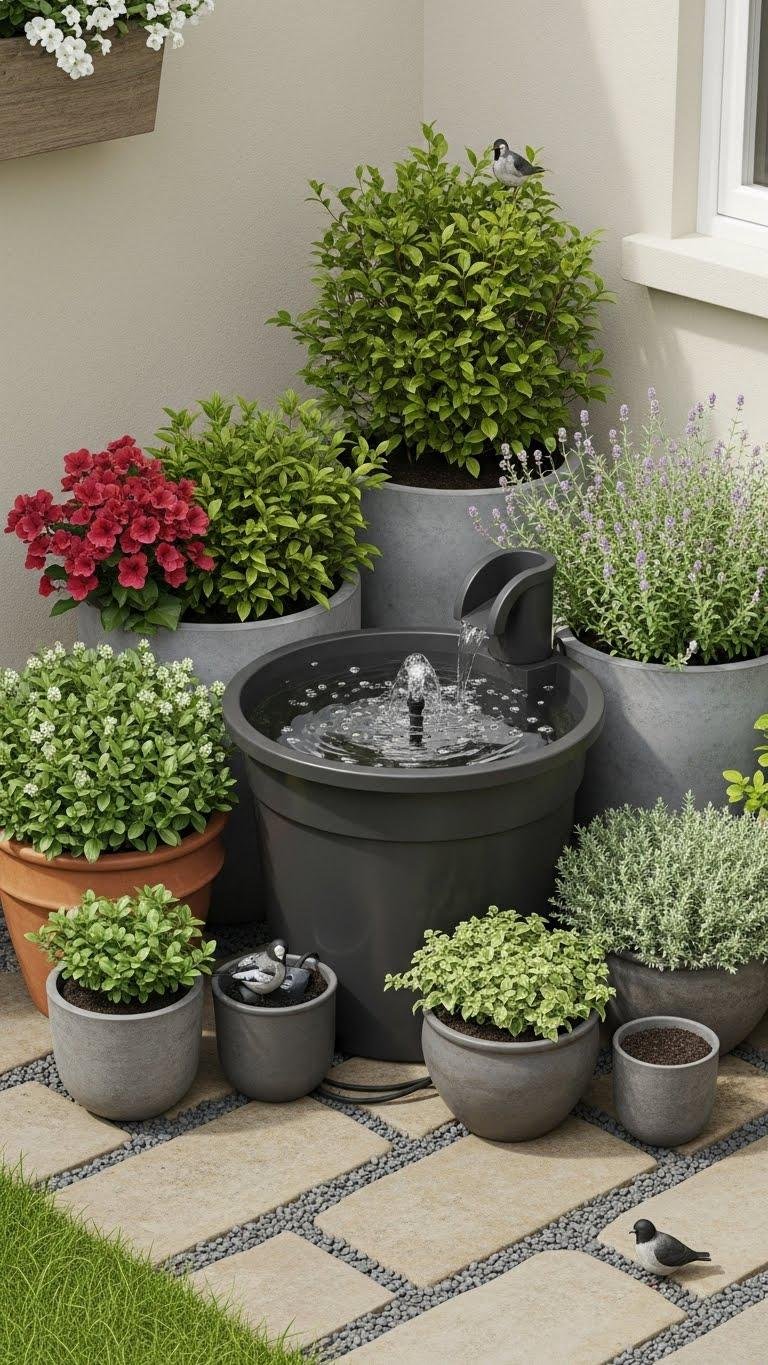 You’ll place a compact basin among pots to create a tea garden nook or a bird sanctuary focal point. Choose weatherproof materials, a quiet pump, and low-maintenance plants.