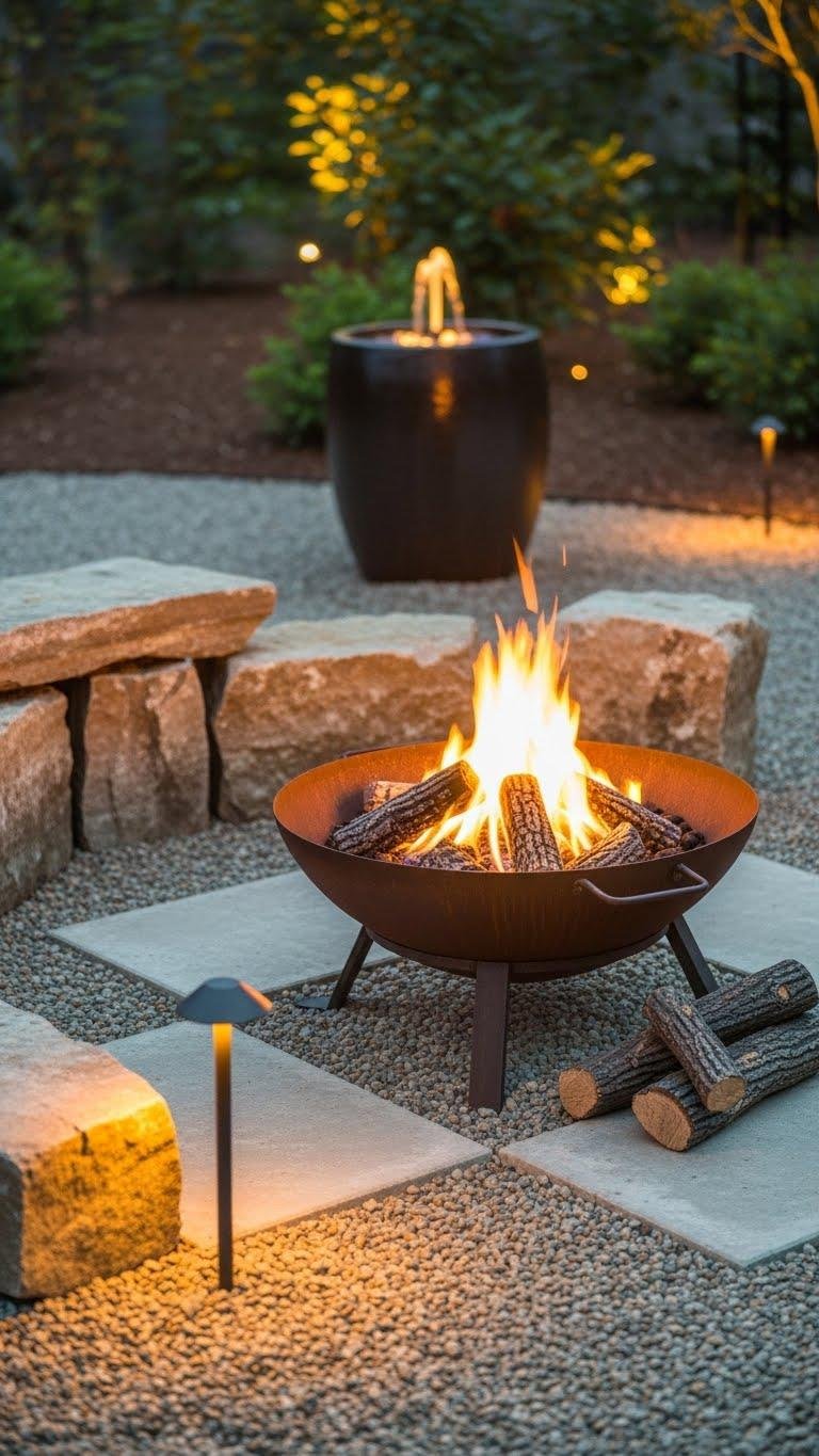 You can pair the gentle sound of a container fountain with the warm glow of a fire pit to extend evening use and create layered focal points.