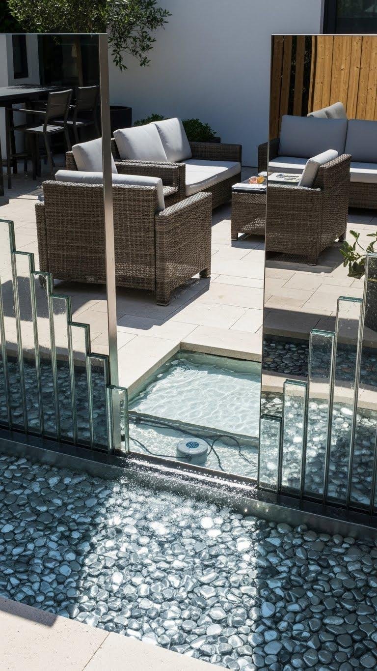 You’ll route a slim recirculating stream over mirrored pebble or staggered glass tiles for shimmer and low maintenance. Install a shallow basin and hidden pump, angle panels for privacy, and enjoy a calming, liberated outdoor nook that feels expensive.