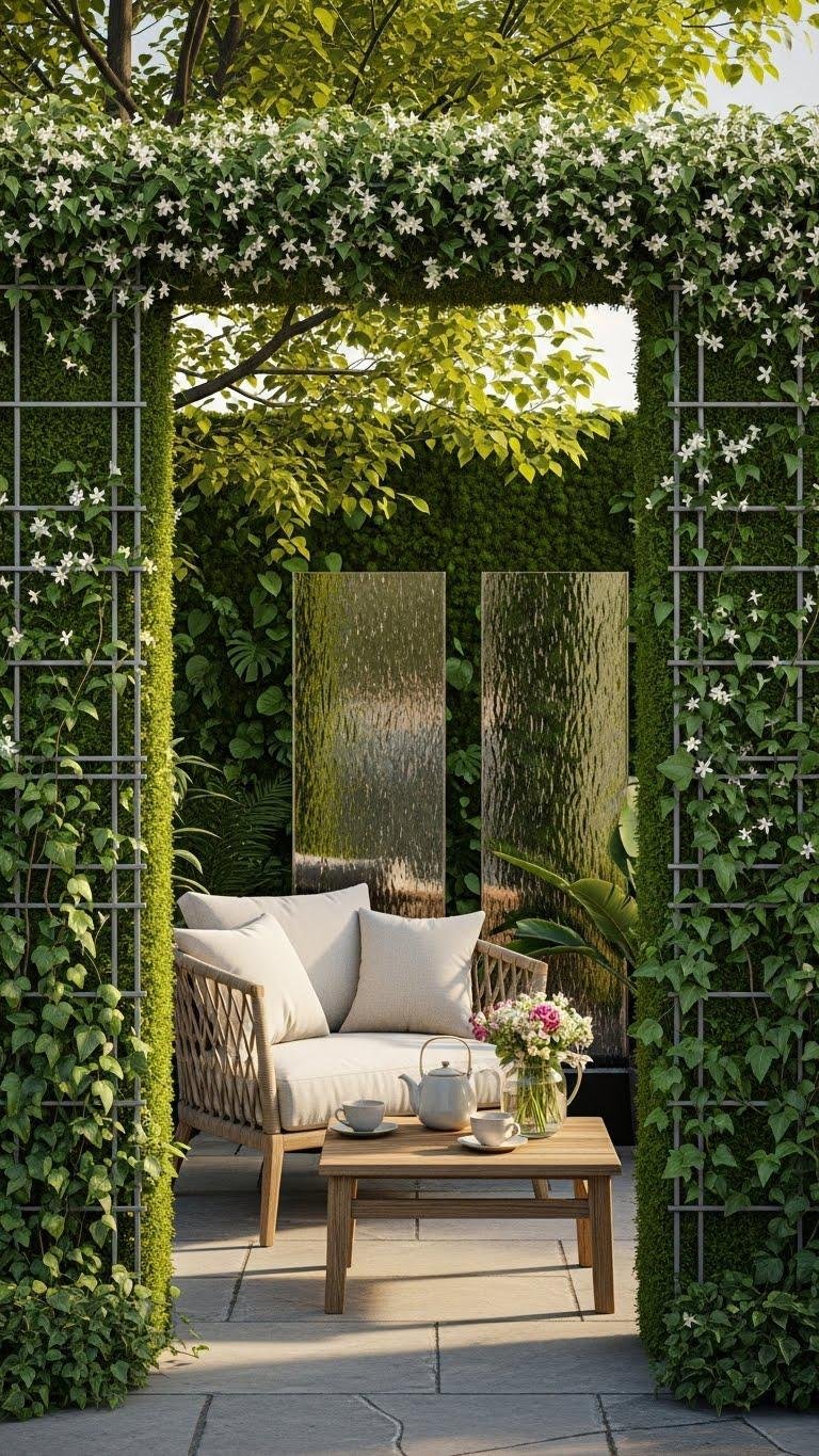 After the shimmer and sound of water panels, green walls and trellis screens bring living texture and seasonal color to the same seating nook.