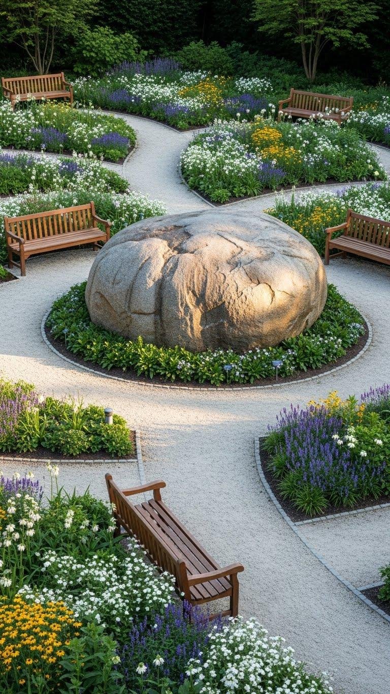 Set a single boulder or sculptural plinth as the anchor of your garden to give the space an unmistakable center—you’ll create a visual pause that organizes paths, beds, and seating. Choose a monolithic focal point with simple lines and a textured plinth to catch light and touch. Position it where sightlines converge, leave surrounding space uncluttered, and let the form define movement and calm.