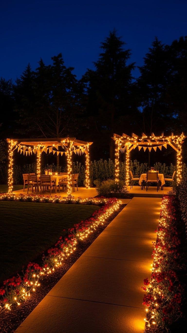 You’ll frequently reach for warm LED string and festoon lights when you want instant atmosphere and flexible layout options; their soft amber glow defines gathering spots, outlines pergolas, and draws the eye along pathways without competing with layered fixtures.