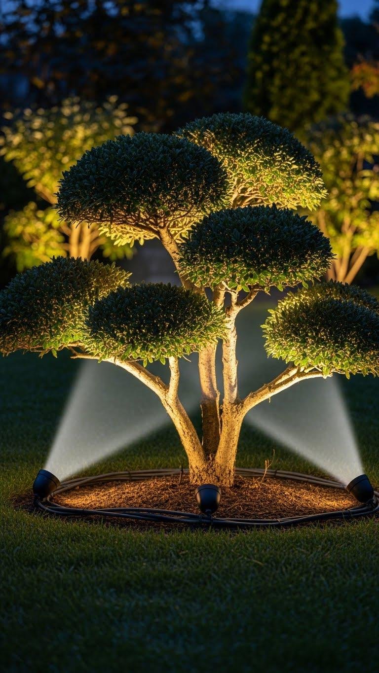Highlight a favorite tree or sculptural shrub with low-voltage spotlights to give your garden a focal point without blinding glare. You’ll aim lights low for an accent wash that sculpts branches and texture.