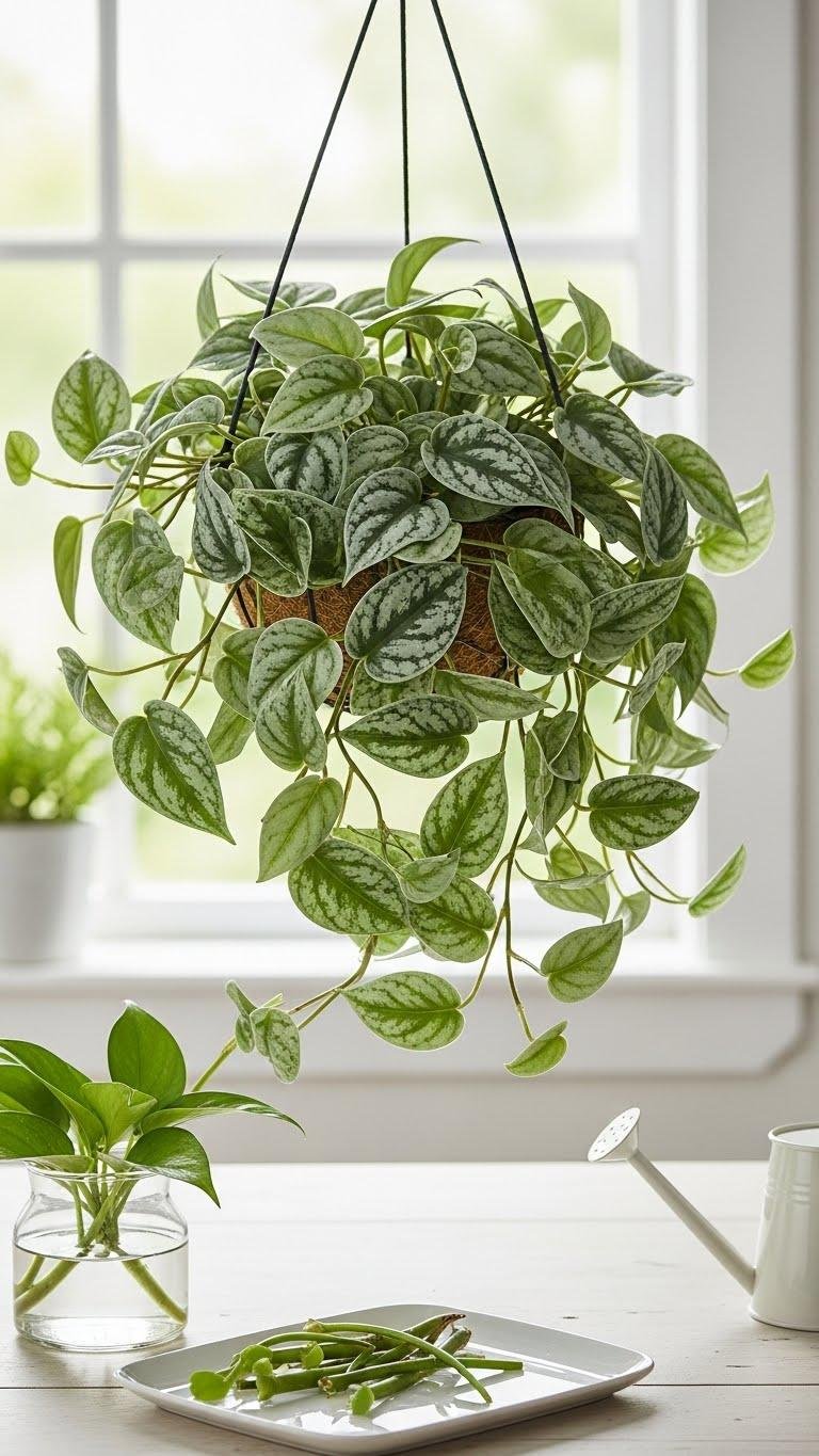 Often overlooked for pothos, Scindapsus (Satin Pothos) rewards you with velvety, silver-speckled leaves and a compact, trailing habit that fits shelves, hanging baskets, or small spaces.