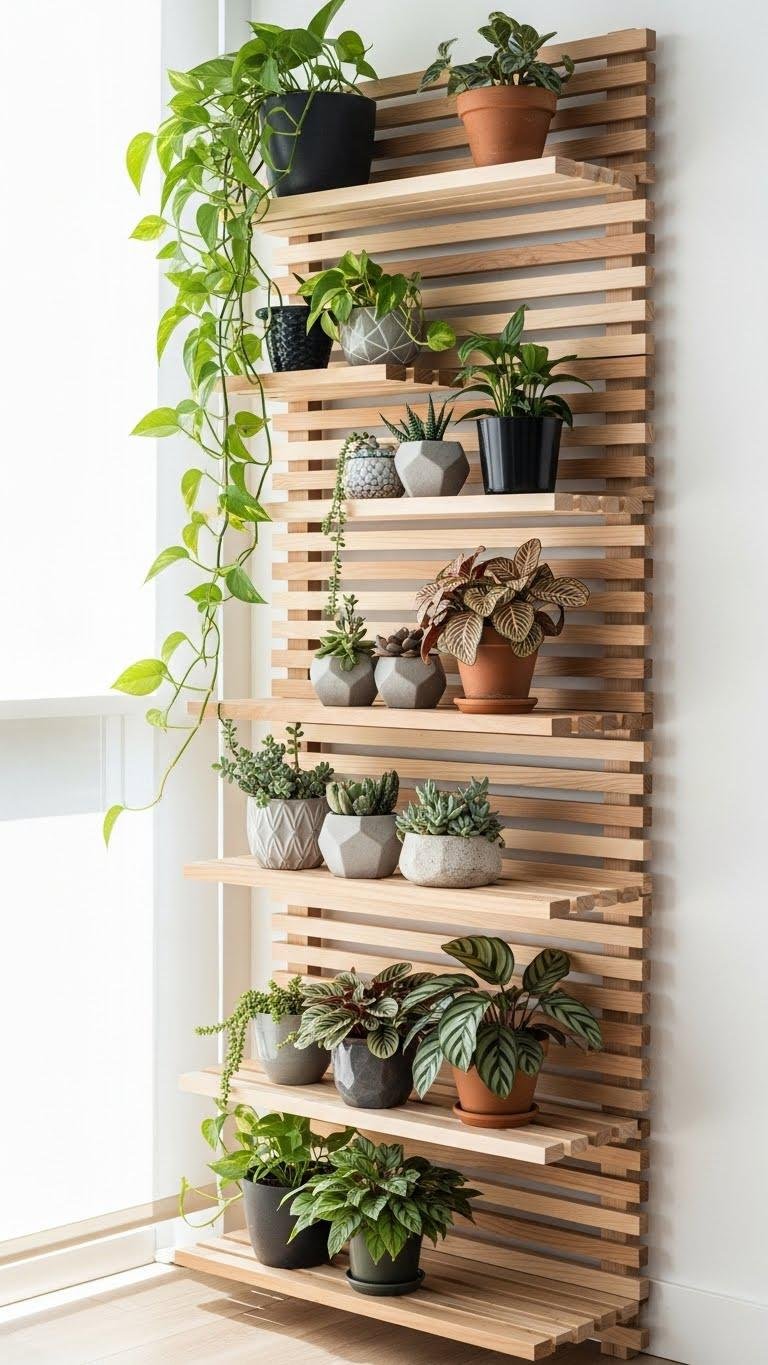 If you want to save floor space and give your plants a clean, modern display, a wall-mounted slatted shelf is an elegant, practical choice.