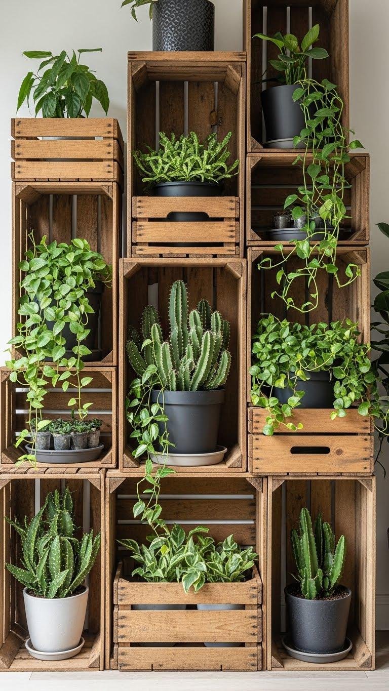 Use crate stacking to mix sizes, rotate pots for light, and add drainage trays. Vertical crates save footprint while showcasing trailing vines and sculptural succulents, giving you freedom to customize height, spacing, and style.