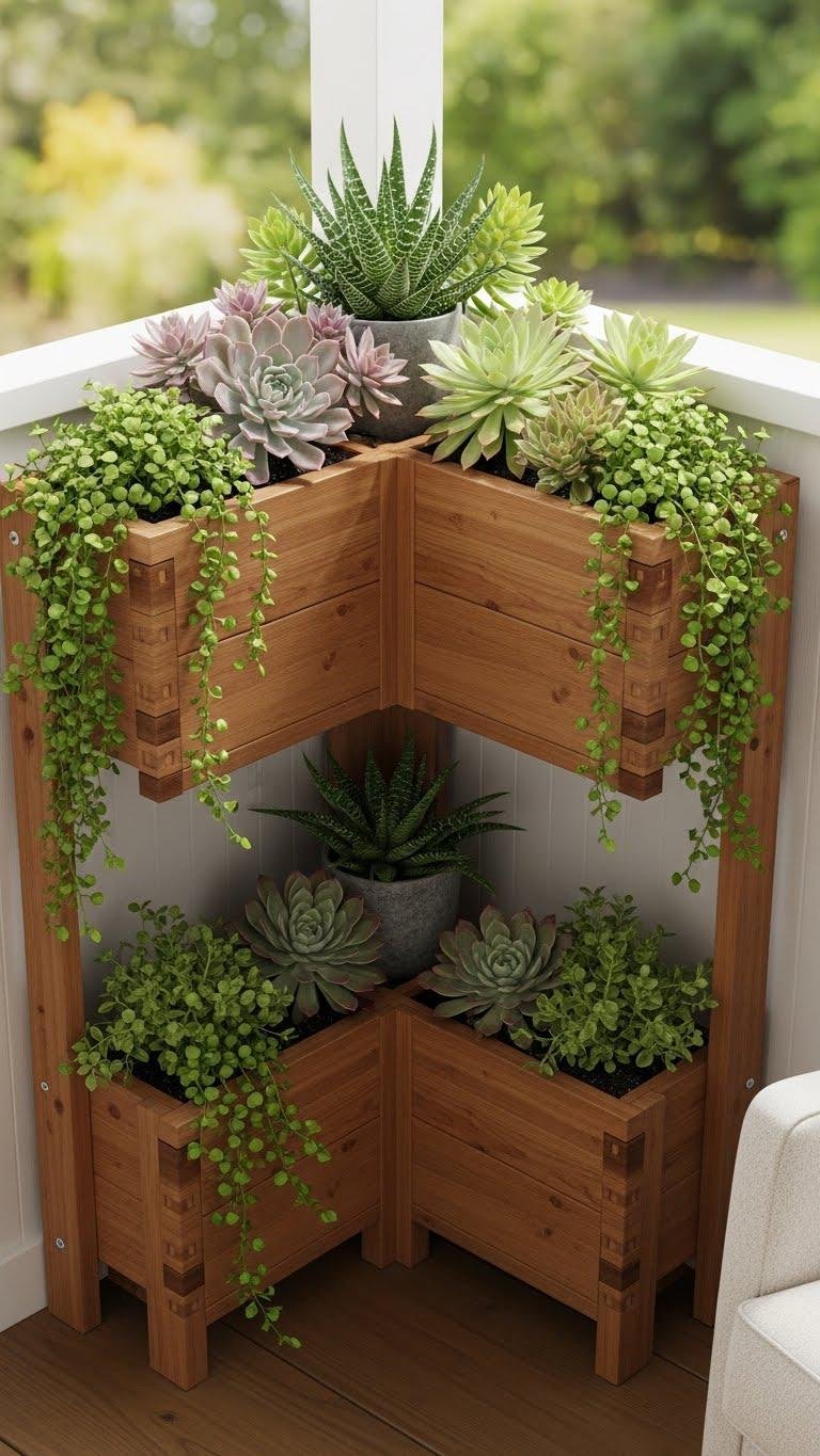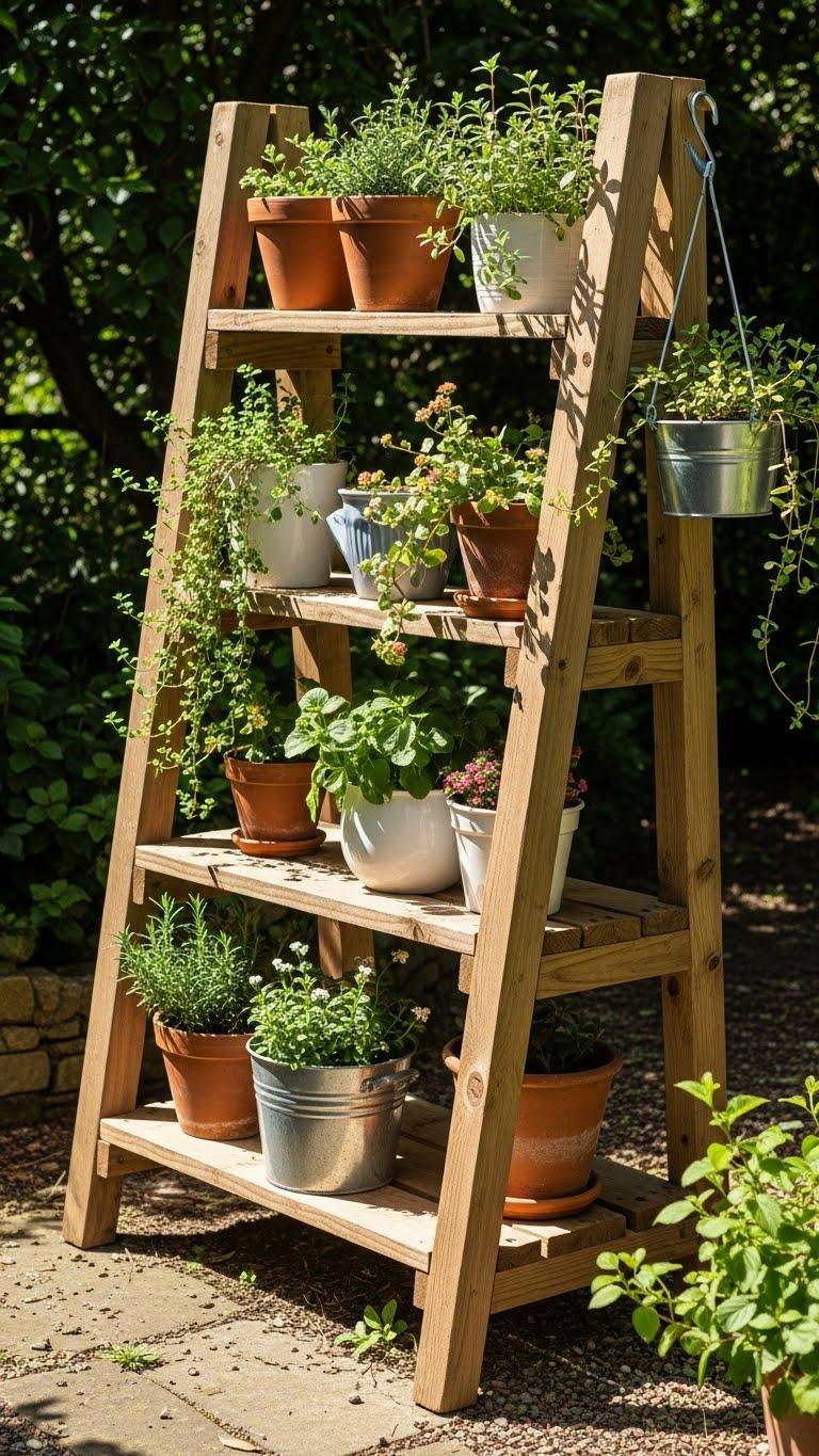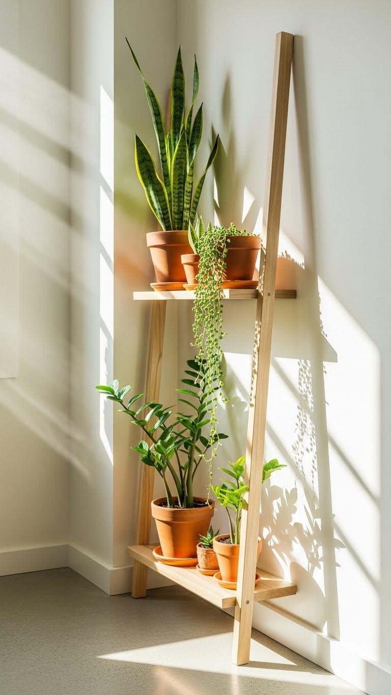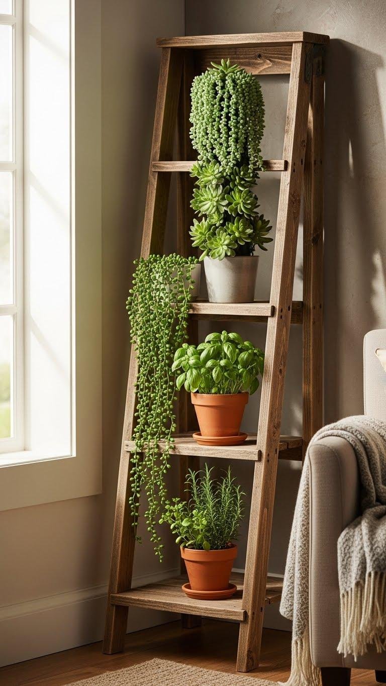Lean a corner ladder planter shelf into unused angles to turn wasted space into a layered display that’s both pretty and practical.