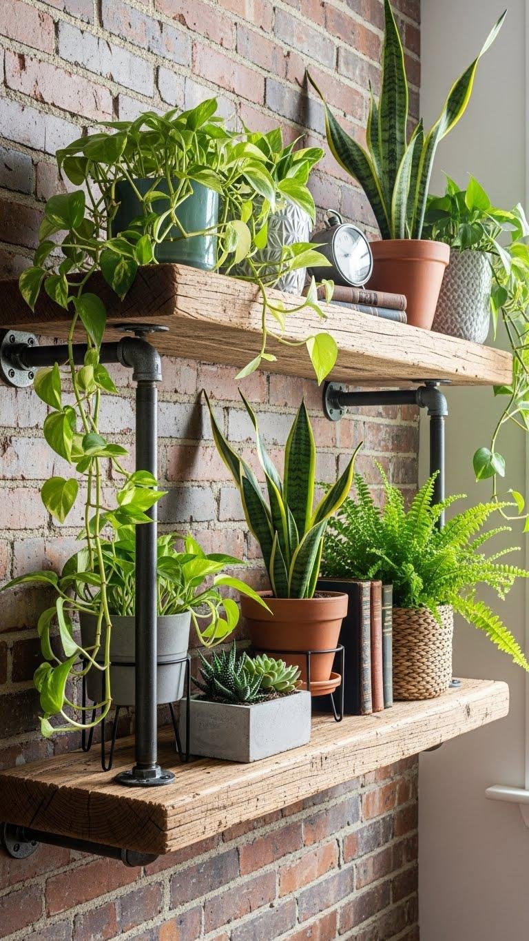 If the lean-to shelf gave you a way to lift plants off the floor, rustic pipe and board shelves offer a sturdier, more industrial-flavored option that still celebrates greenery and light.