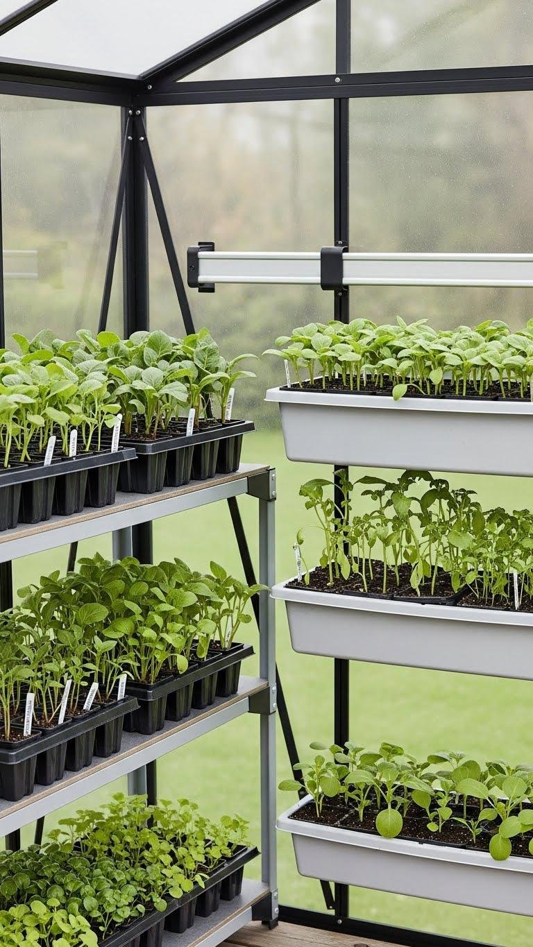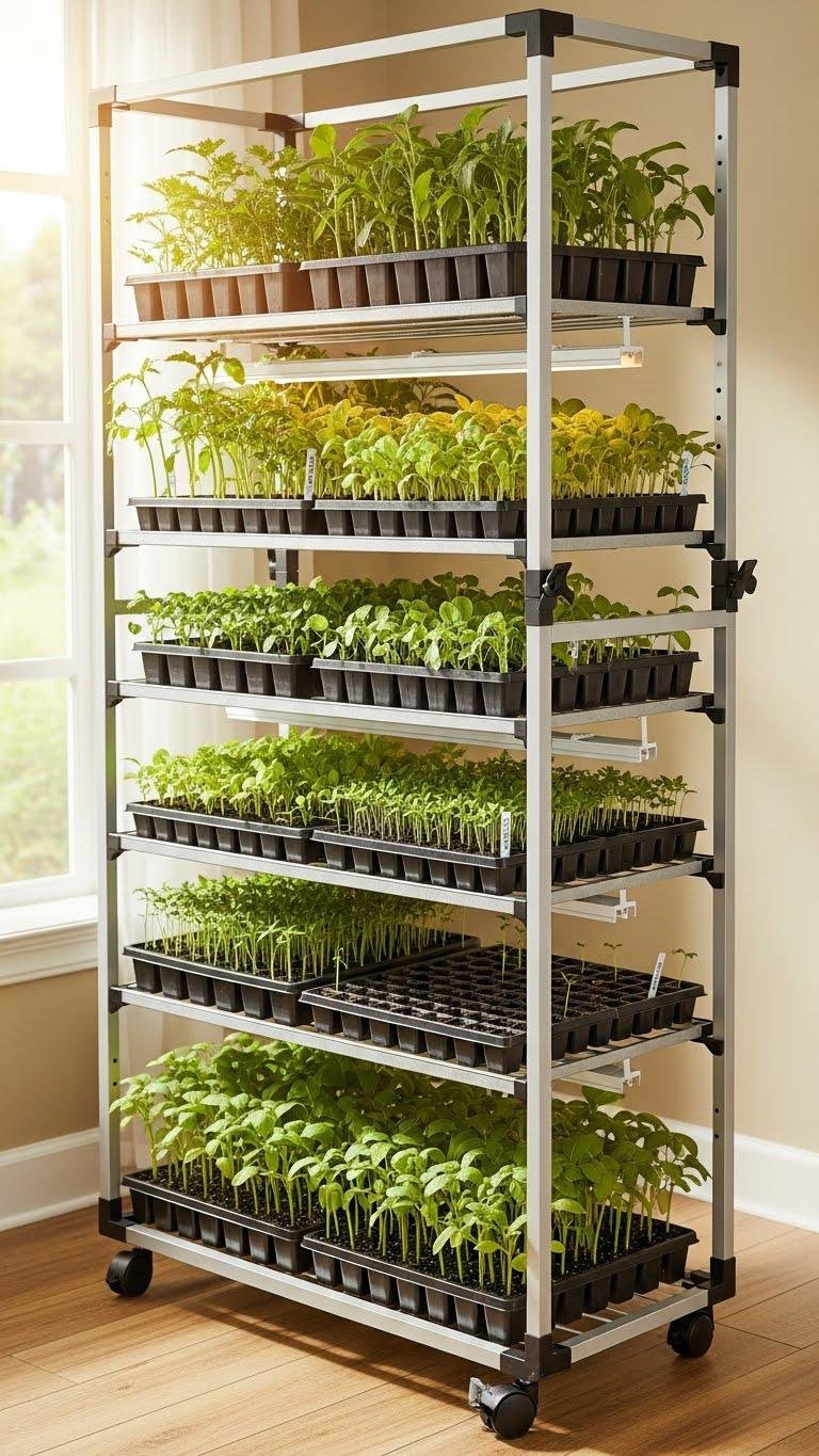 Raise seedlings to the perfect light with an adjustable-height rack that grows with your plants: you can move shelves up as stems lengthen, tilt trays toward sun patches, and cluster heat-loving seedlings on the highest tier.