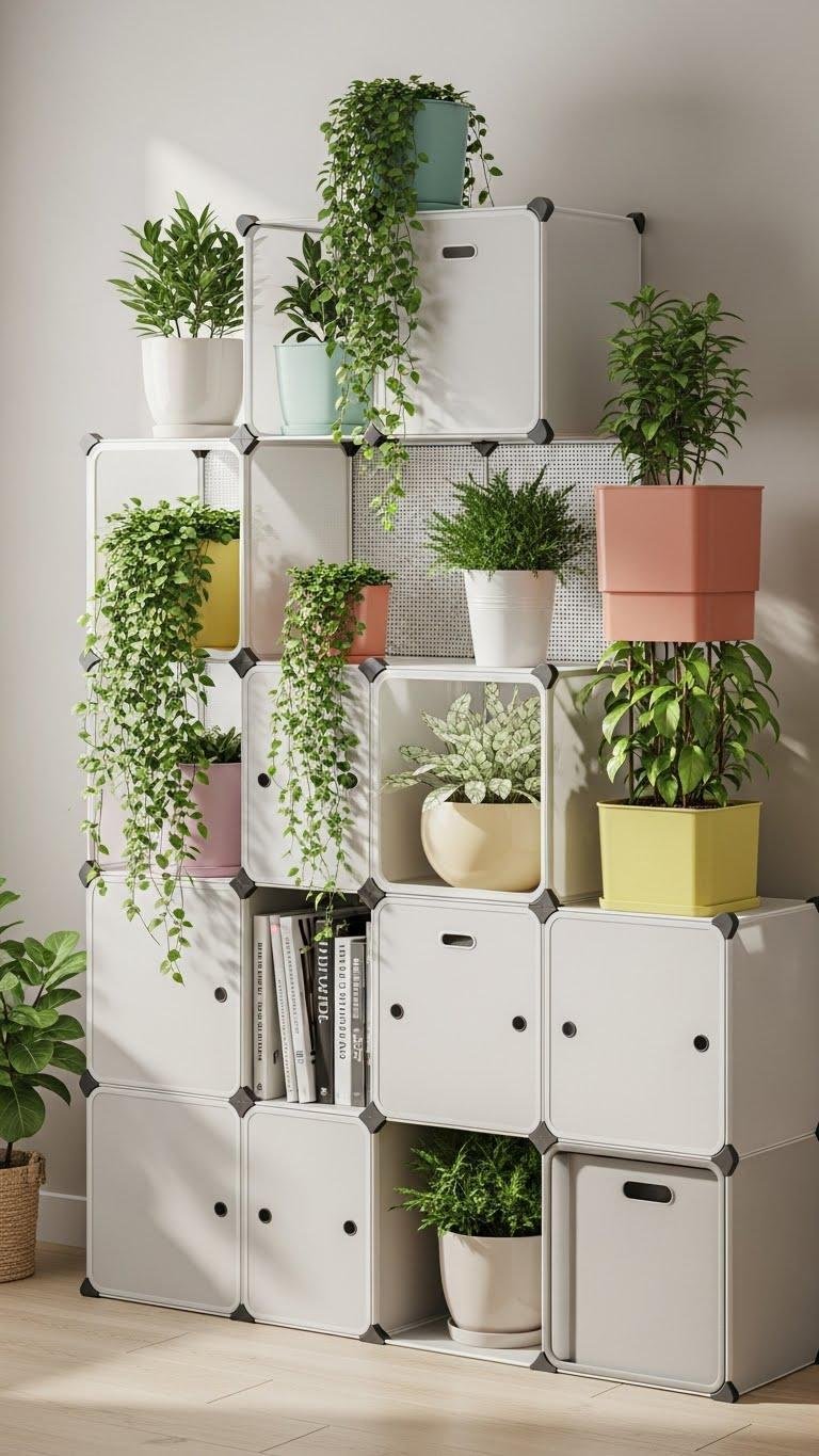 Think of a modular cube plant organizer as a customizable grid that lets you mix pots, trailing vines, and storage in a neat, vertical footprint.