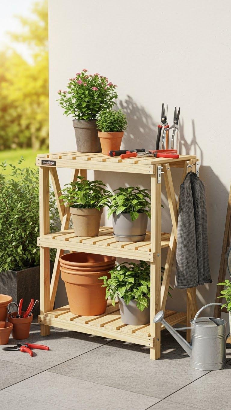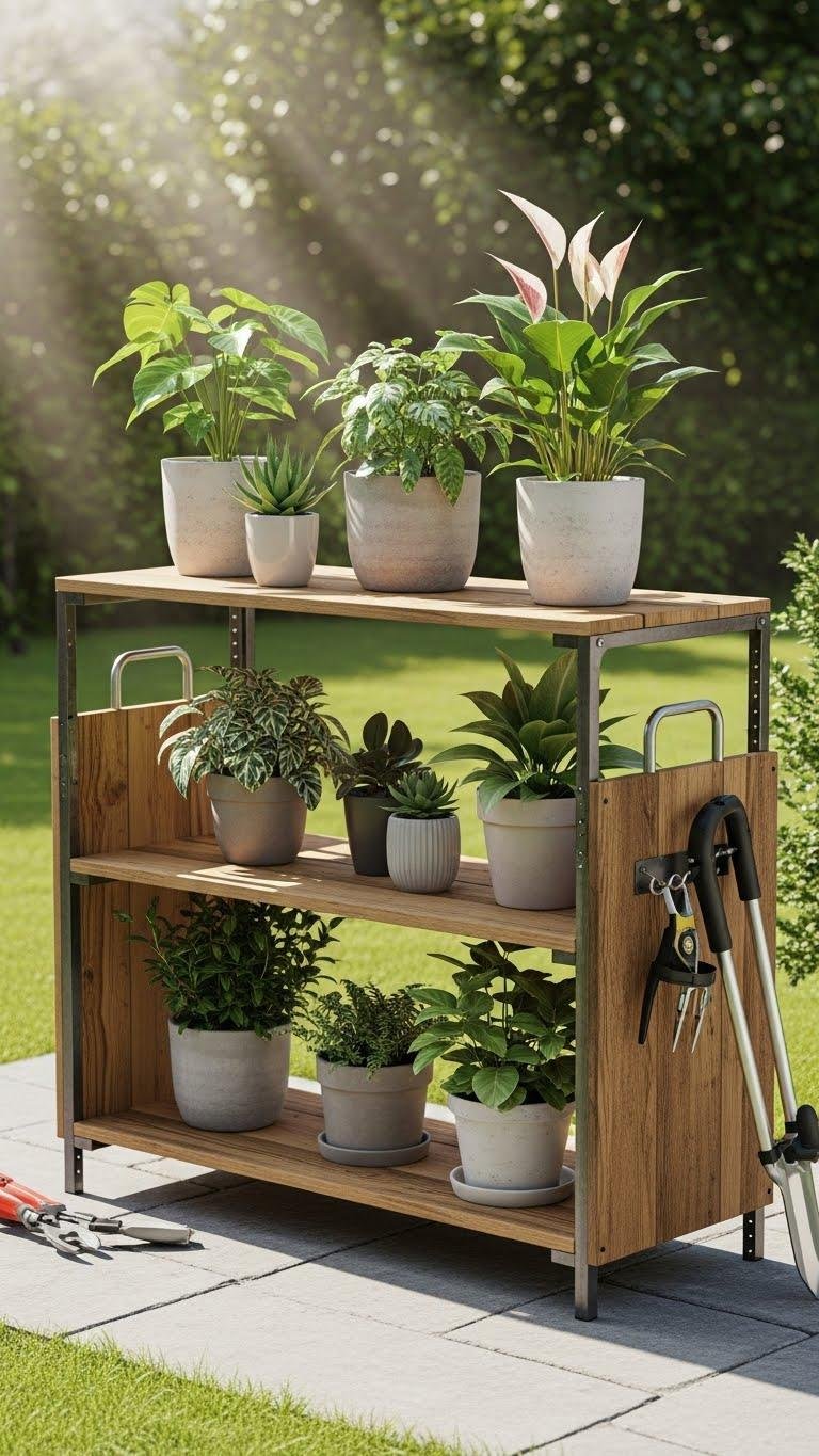 It frees up floor space, keeps tools handy, and lets your plants breathe.