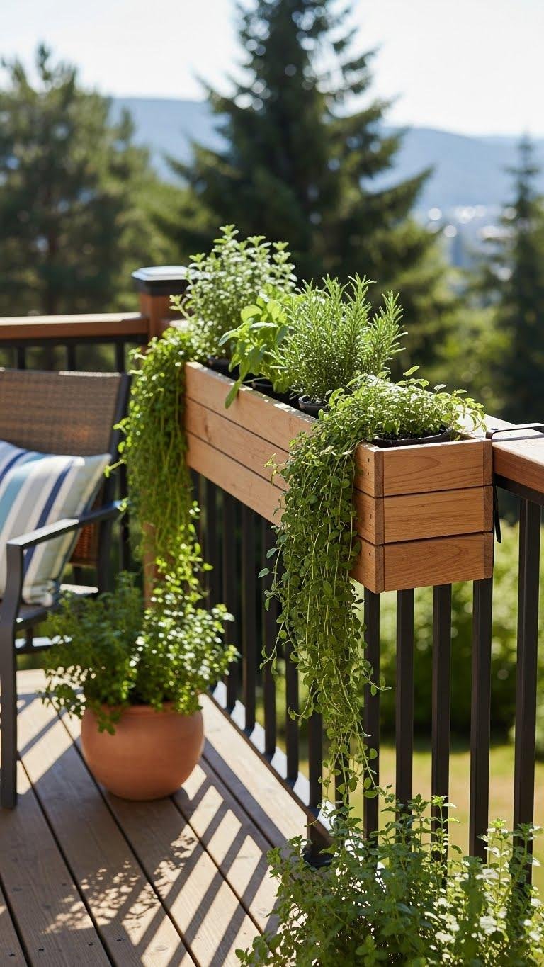 Arrange railing herbs and trailing vines for scent and privacy. It’s a clean, liberated setup that maximizes sunlight, keeps maintenance simple, and showcases your plants.