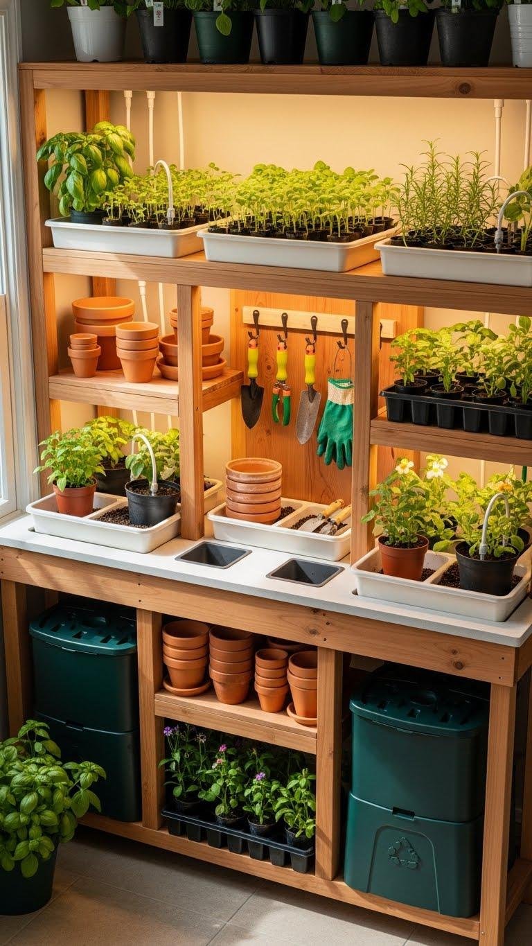 Add a removable shade canopy for tender seedlings, and choose reclaimed wood or metal for a liberated, low-maintenance look that keeps everything organized and accessible.