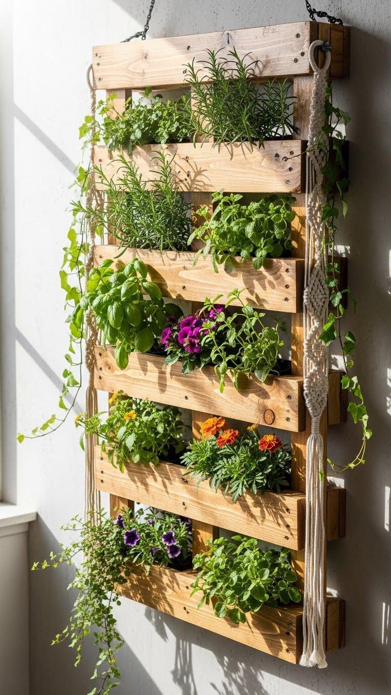 A hanging pallet plant rack turns a simple shipping pallet into vertical garden art, letting you suspend herbs, blooms, and trailing greens to free up ground space and catch more light.