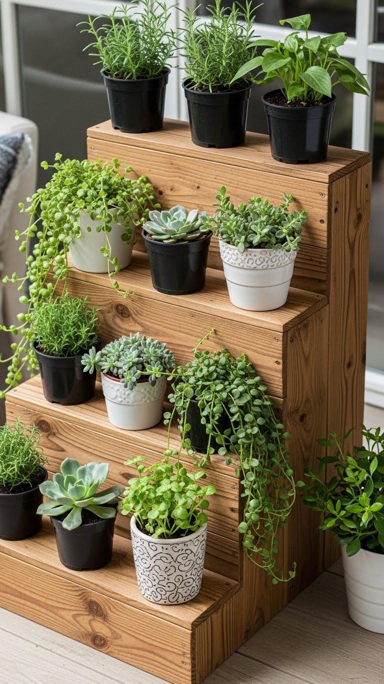 When you build a reclaimed wood tiered stand, you’ll create a compact, sculptural display that lifts pots of herbs, succulents, and trailing plants into eye-catching layers.