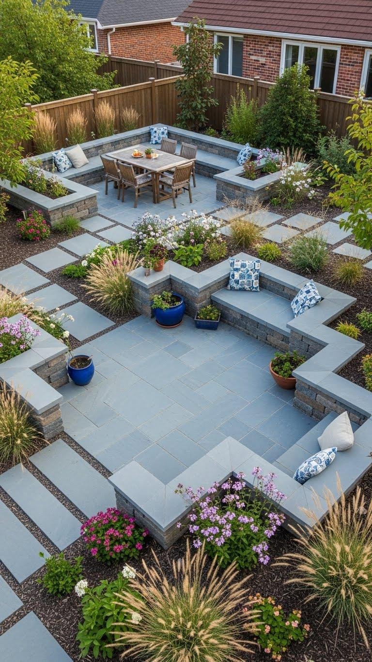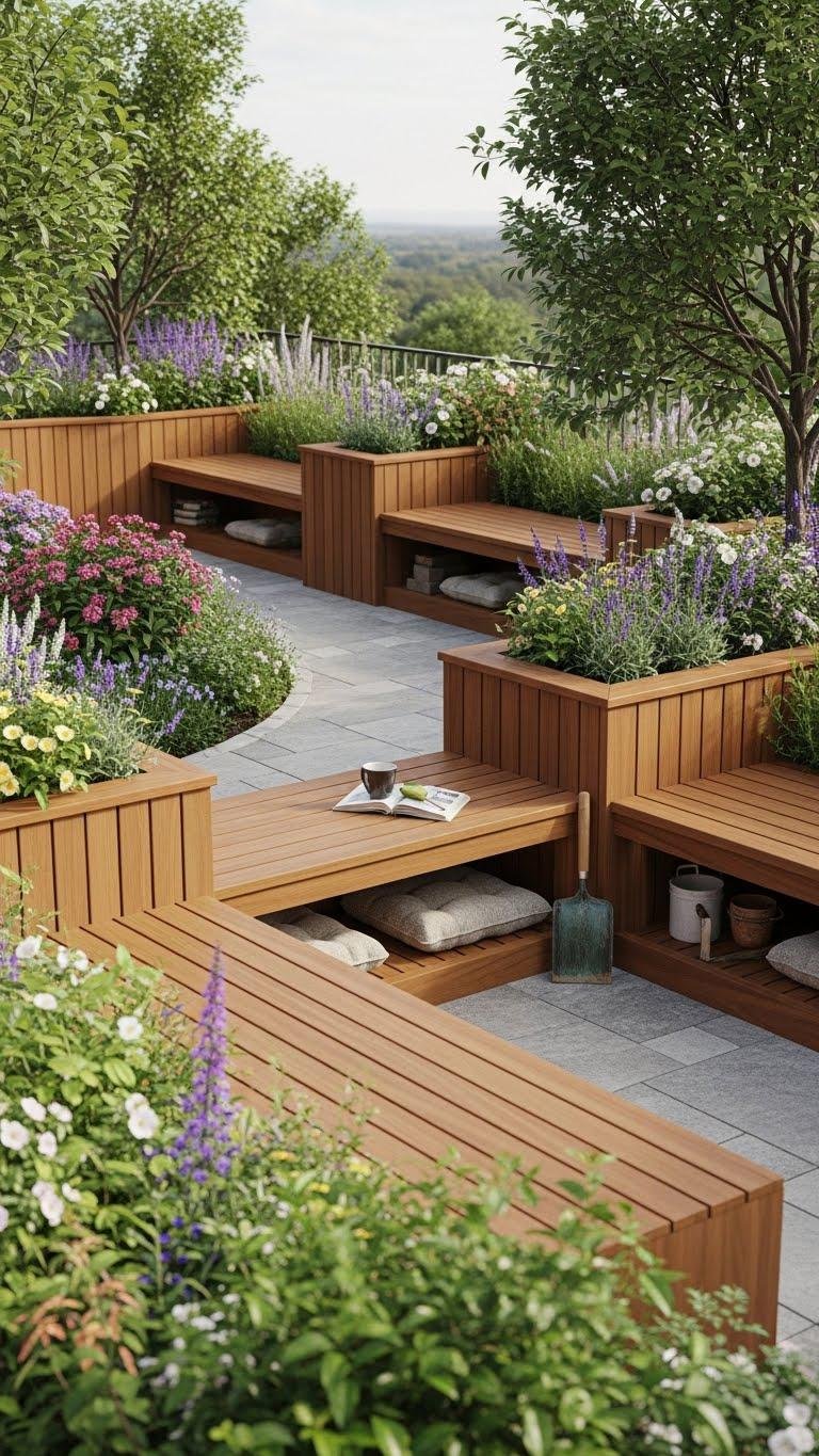You’ll favor teak seating for warmth, curved benchwork to follow pathways, and planter integration that frames views.