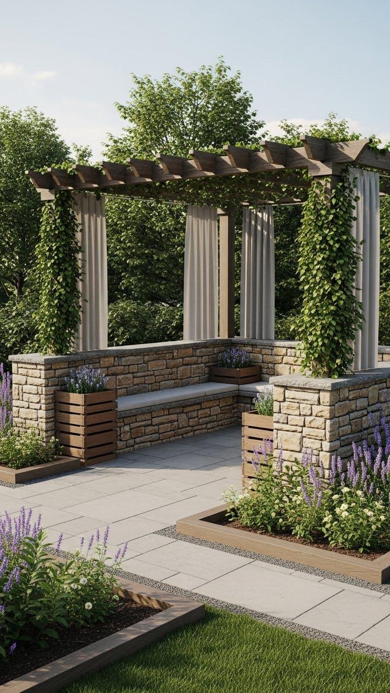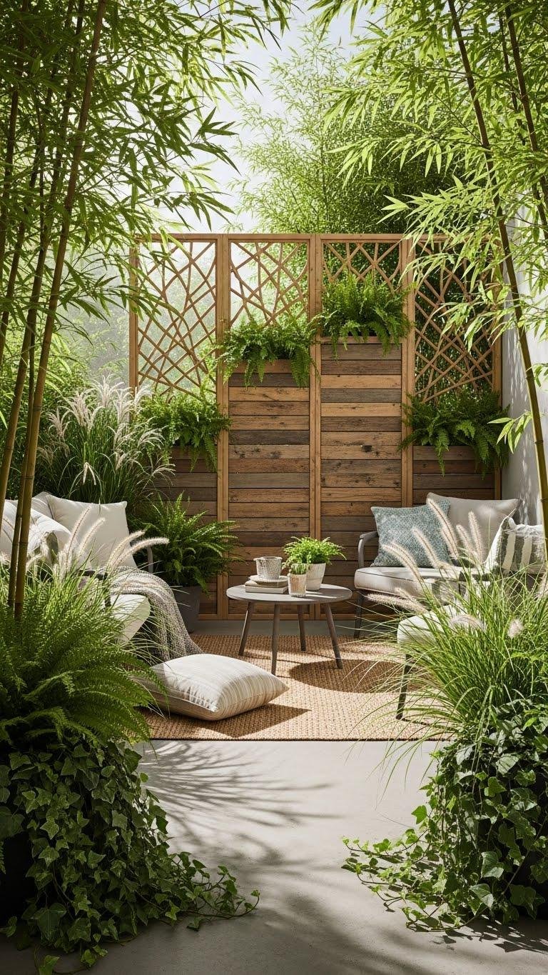 Frame your patio with a living screen of bamboo or weathered reclaimed wood to carve out a sheltered, plant-forward room. You’ll use bamboo latticework or reclaimed paneling to sculpt sightlines, anchor containers, and soften edges with ferns, grasses, and trailing ivies.