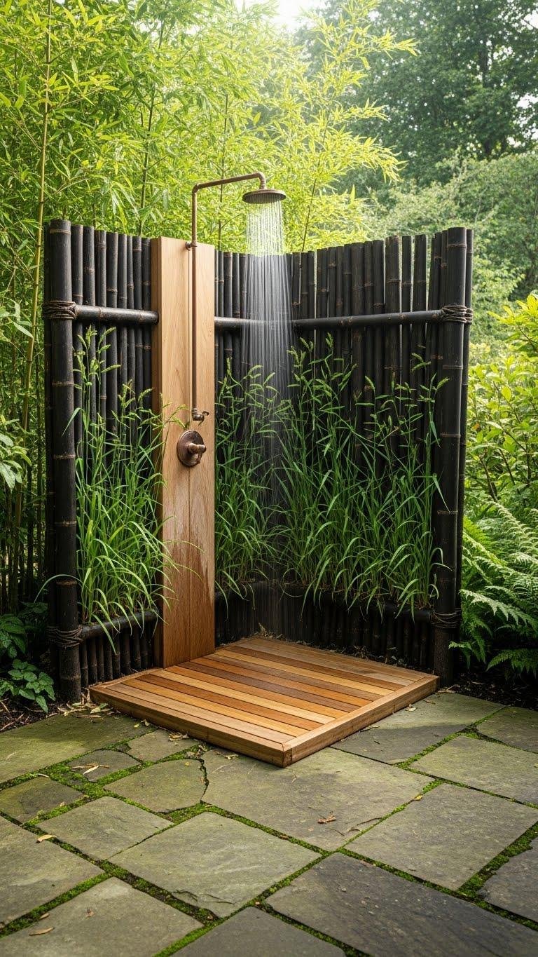 Add a green privacy enclosure of bamboo or slatted wood so you rinse off surrounded by foliage and freedom.