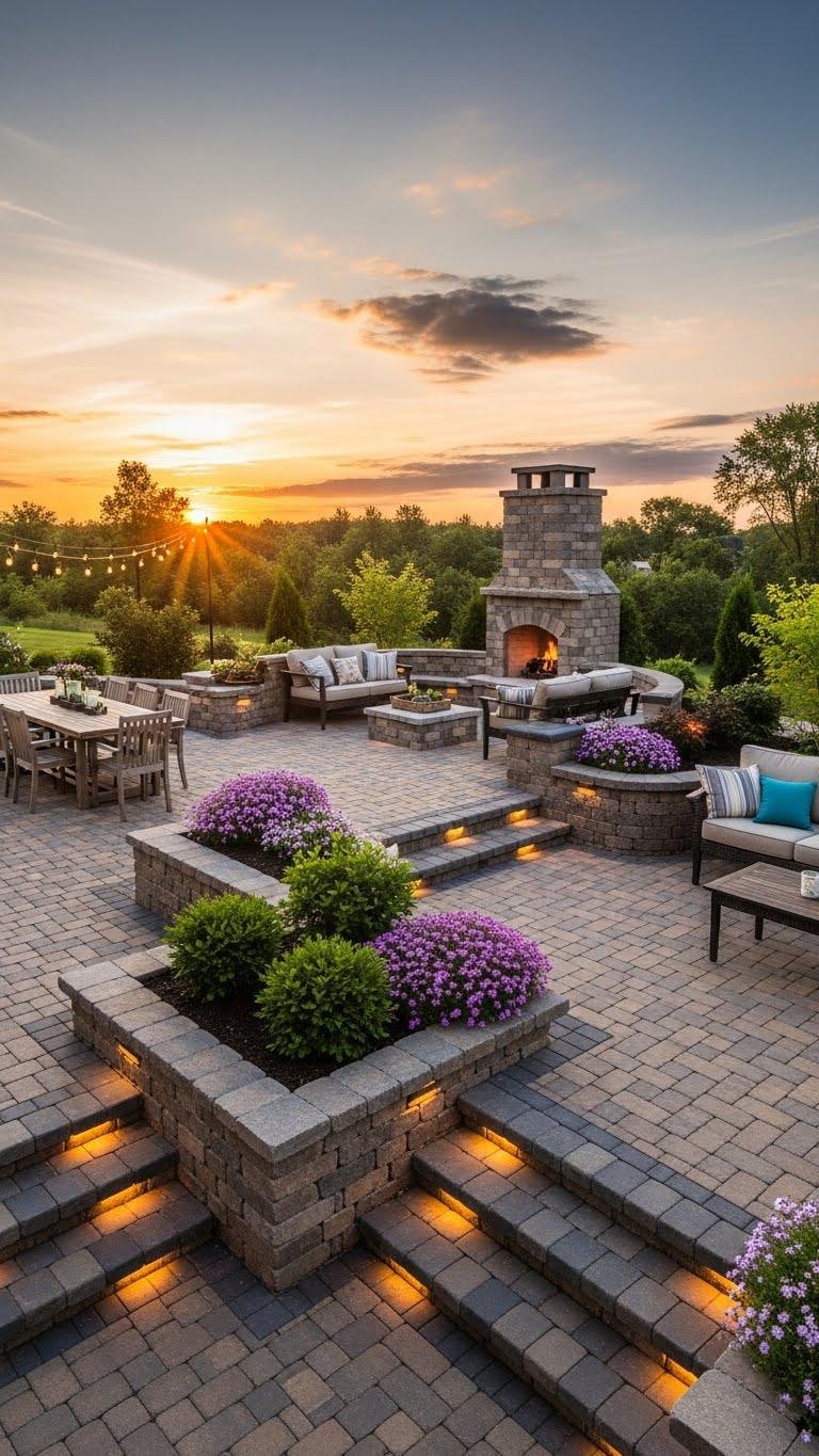 Anchor your outdoor rooms by layering paver levels that step down toward a custom fireplace, creating distinct zones for dining, lounging, and planting.