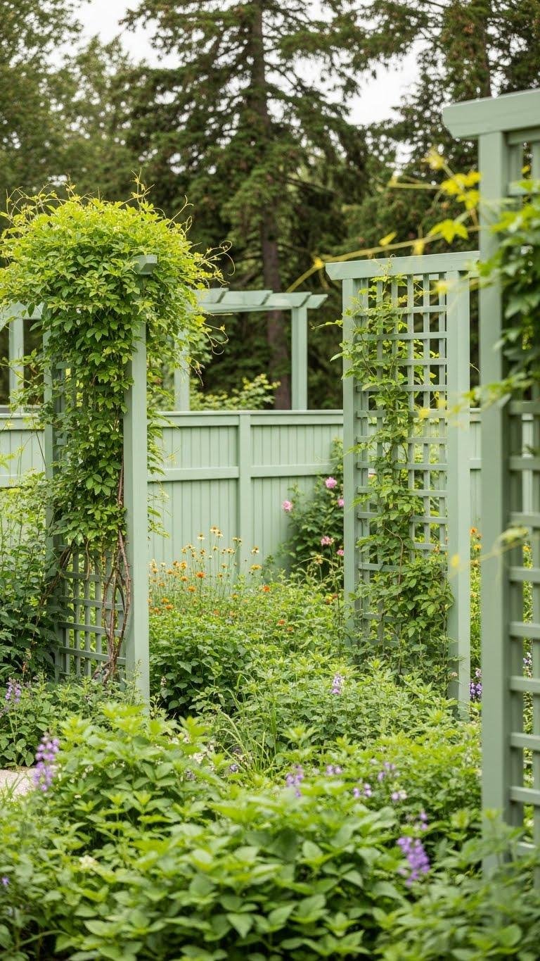 By painting fences and trellises Go Away Green, you let structures recede so plants take center stage — foliage, blooms, and textures read as uninterrupted.
