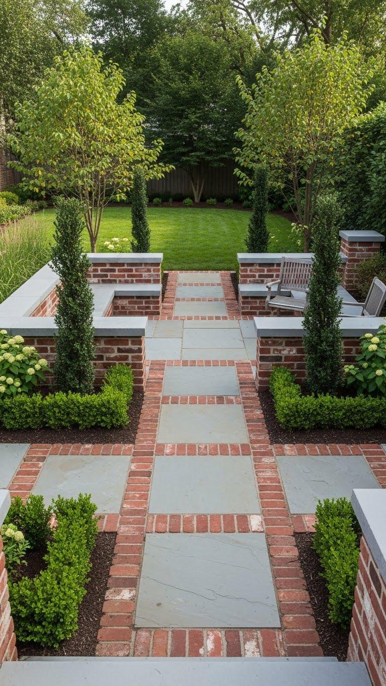 Anchor your overgrown yard with bold accents of brickwork that both define circulation and showcase sculptural greenery. You’ll place a rustic keystone path and low walls to frame seating and sightlines, then plant sculpted boxwood and columnar specimens for rhythm.