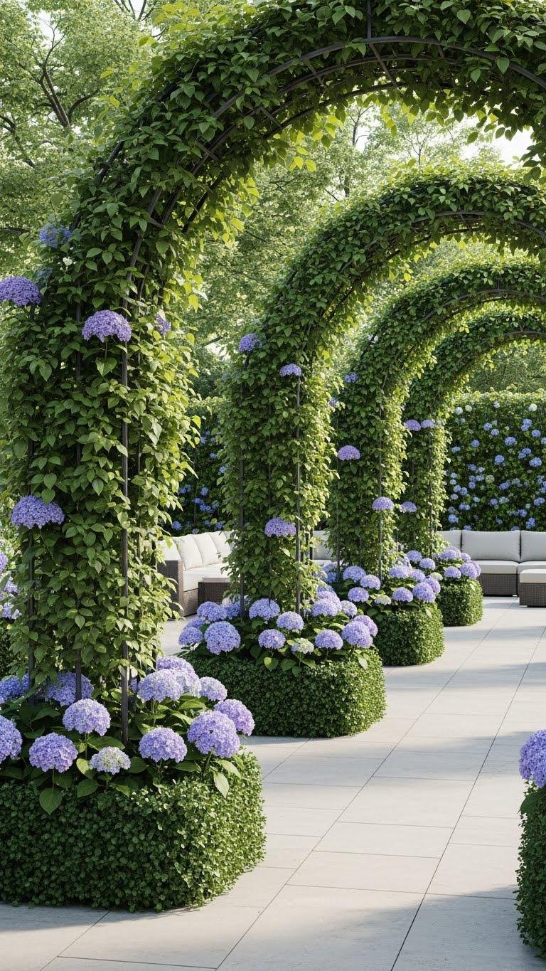 Layer vertical trellises close to the patio edge to lift the garden upward and give climbing hydrangeas room to unfurl their mophead blooms. You’ll arrange layered trellises at varying depths so vines weave and cascade without crowding seating.