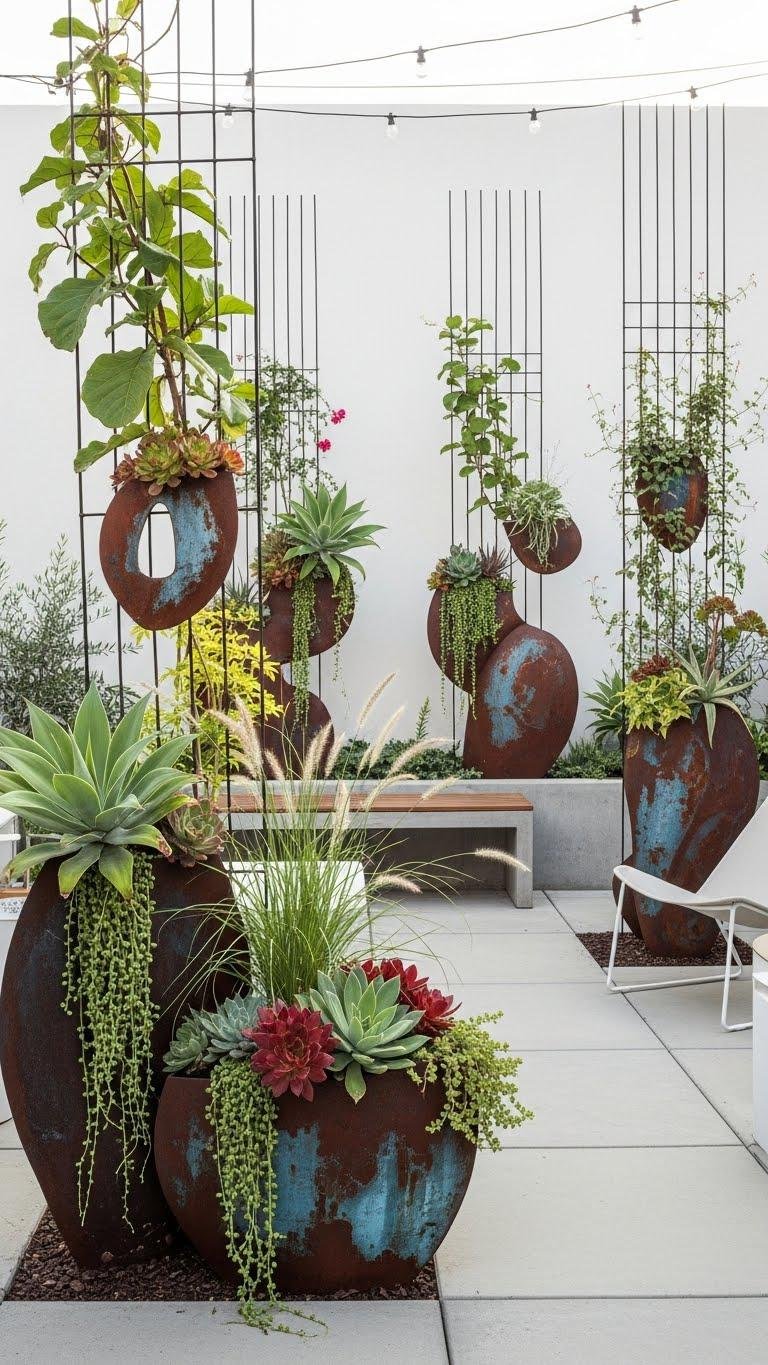 After the airy vertical room created by trellises, bring in recycled metal sculptural planters to anchor and punctuate the space. You’ll place recycled planters as focal points, pairing metal sculptures with resilient succulents, grasses and trailing vines.