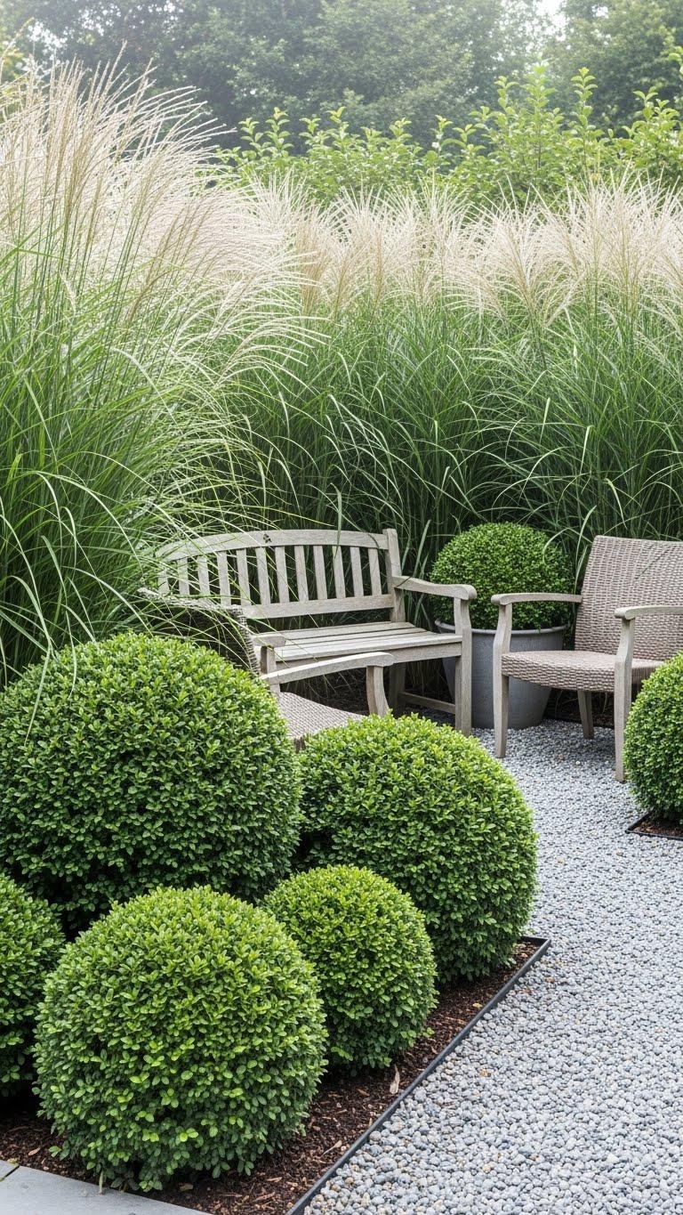 If you want a serene nook, plant tall ornamental grasses to rise like a soft curtain and anchor them with clipped boxwood spheres for year-round form and contrast.