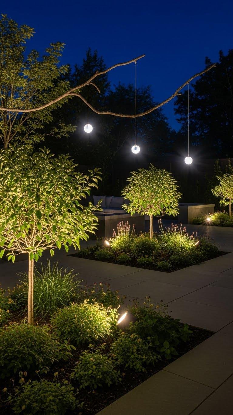 Place LED uplighting at the base of specimen shrubs and small trees to reveal texture. Suspend subtle moonlighting pathways from branches for safe, ethereal routes. You’ll control mood, extend evenings, and keep sightlines open—letting plant forms breathe and you move freely.