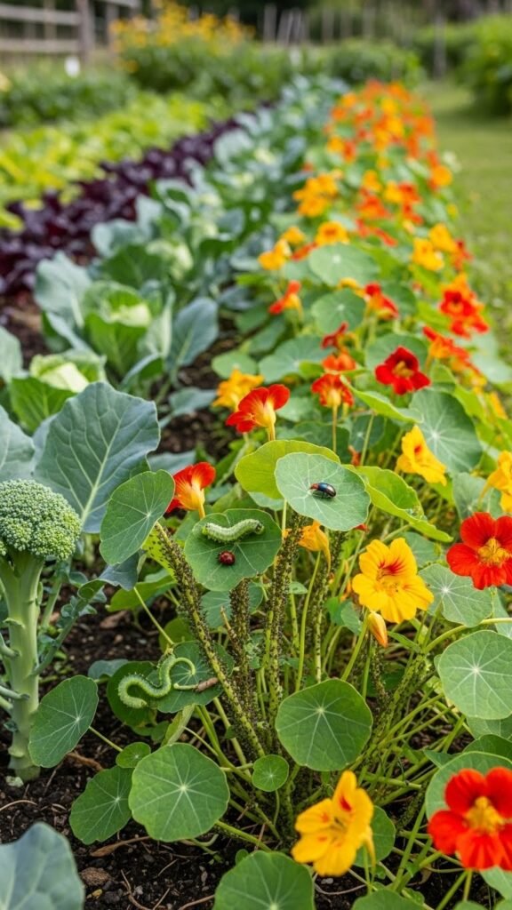 Use nasturtiums as sacrificial trap crops around brassicas to lure aphids, cabbage loopers, and flea beetles away from your main plants. Plant them at edges for companion planting benefits, attracting pests and beneficial insects.