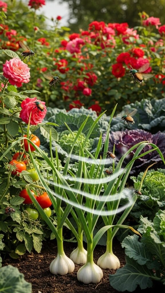 Garlic makes an excellent companion plant for repelling many common garden pests because its strong scent masks the odors pests use to find hosts; plant cloves near roses, tomatoes, and brassicas to deter aphids, Japanese beetles, and certain fungal diseases.