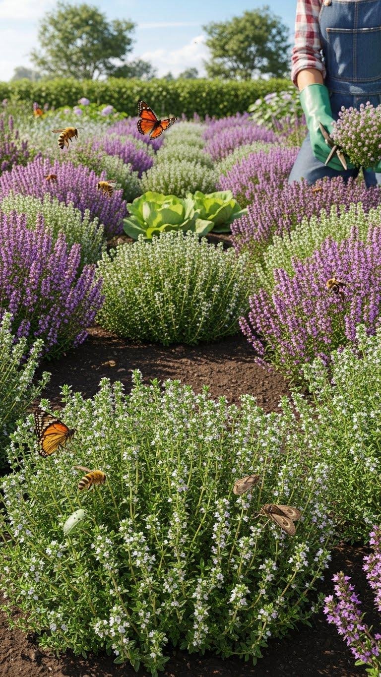 Plant thyme along pathways, borders, or in containers where its low, aromatic habit can repel cabbage moths, whiteflies, and other garden pests while attracting pollinators.