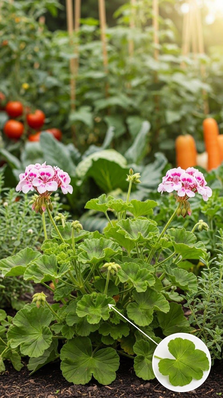 Plant geraniums (Pelargonium spp.) among vegetables and beds where you want to deter leaf-feeding pests and whiteflies; their aromatic foliage emits compounds that many insects find unappealing.