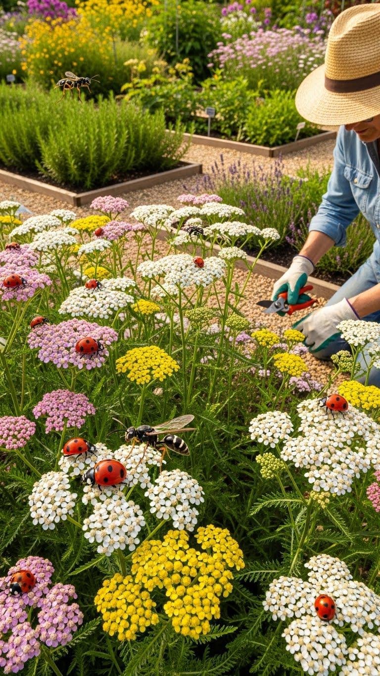 Yarrow (Achillea millefolium) attracts beneficial insects like ladybugs and parasitic wasps while repelling some sap‑sucking pests, so you can use it as a living insectary at the edge of beds or mixed into herb borders.
